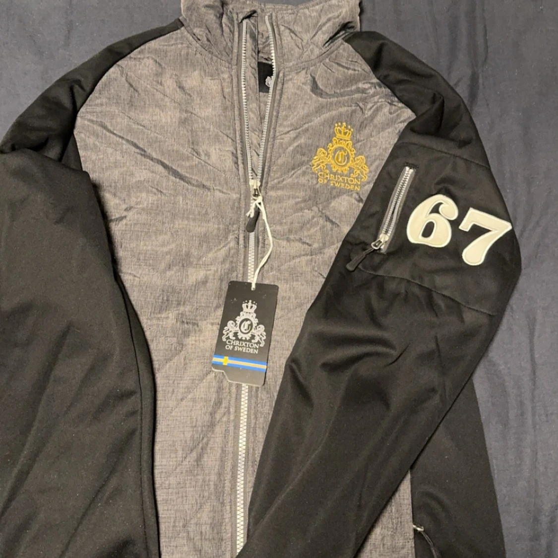 Säljer en snygg grå och svart jacka från Chrixton i storlek M. Jackan har en dragkedja framtill och en cool detalj med siffran 67 på ärmen. Perfekt för höst och vår med sitt stilrena utseende och bekväma passform.