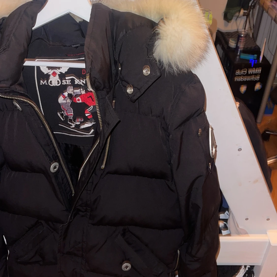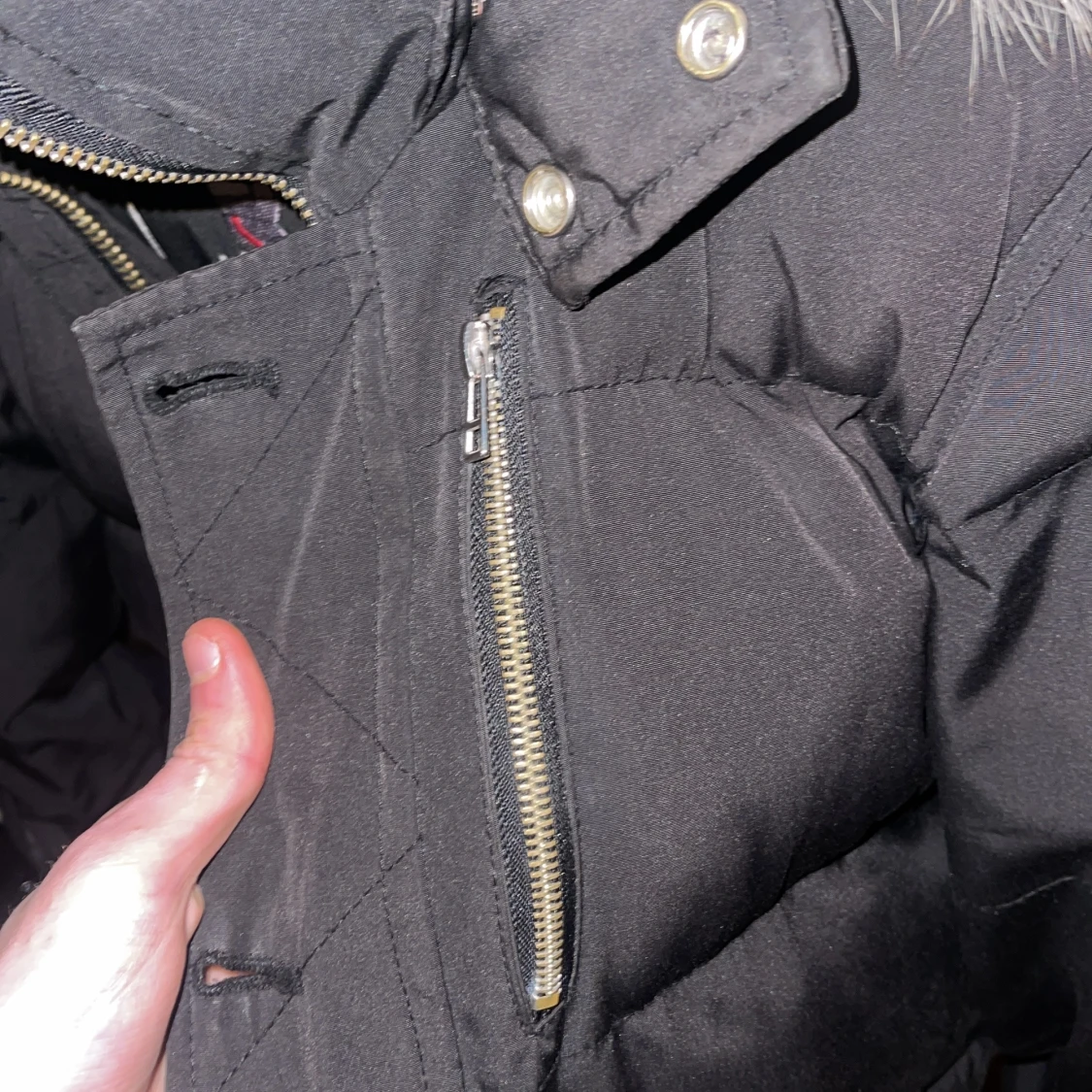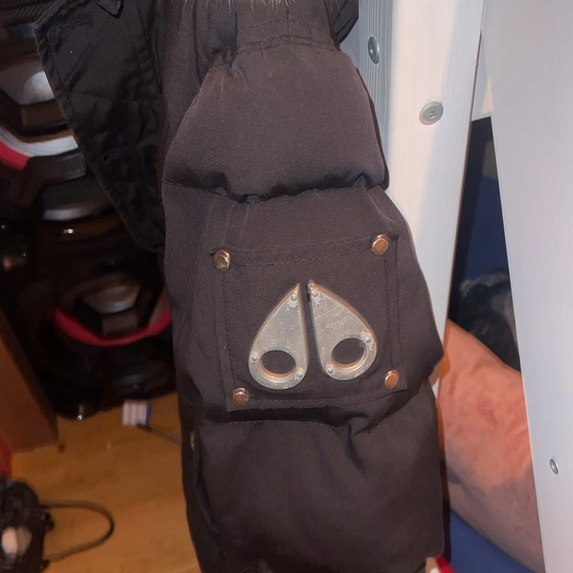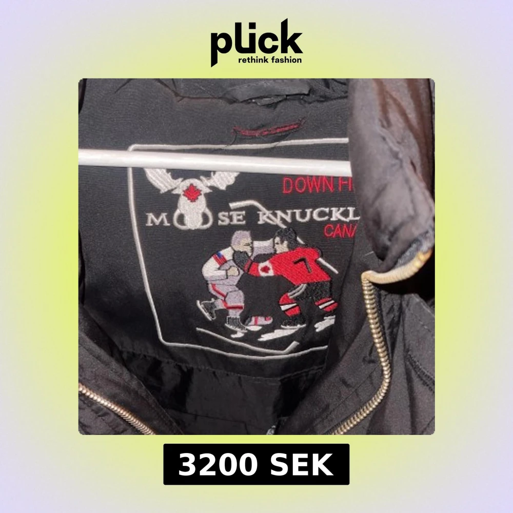 Säljer en svart dunjacka från Moose Knuckles med pälskrage och broderad logga på insidan. Jackan har dragkedja och knappar framtill samt en ficka med dragkedja på ärmen. Perfekt för kalla dagar!