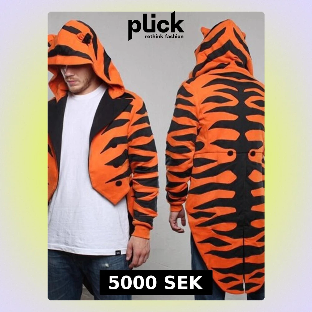 Säljer en orange och svart hoodiejacka med tigrerandigt mönster och coola öron på luvan. Jackan har lång ärm, knappar framtill och en längre svans baktill för extra tiger-vibe. Perfekt för dig som vill sticka ut med djurinspirerad stil.