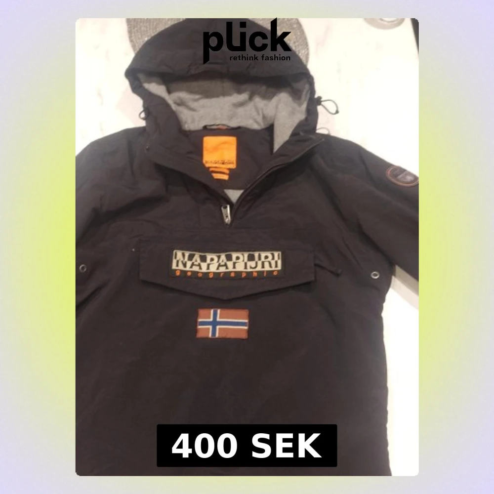 Säljer en svart jacka från Napapijri med huva och stor ficka framtill. Jackan har broderad norsk flagga och tydliga loggor på bröstet och ärmen. Regular fit och tejpade sömmar för extra komfort. Perfekt för dig som vill ha en stilren och funktionell jacka. Pris ej hugget i sten