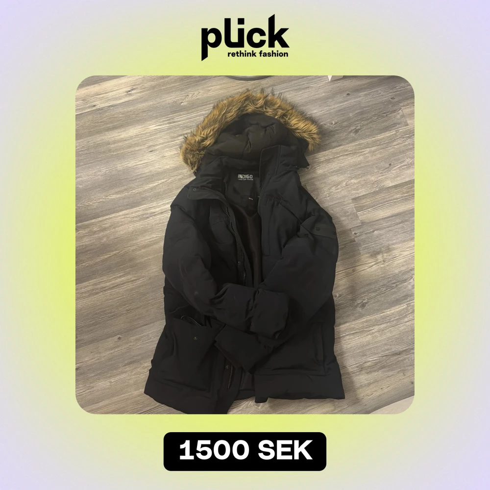 Säljer en svart vinterjacka från Indigo med pälskantad huva. Jackan har en pufferdesign och är perfekt för kalla dagar. Den är knappt använd, storleken är M