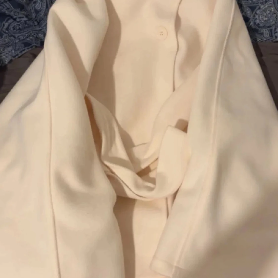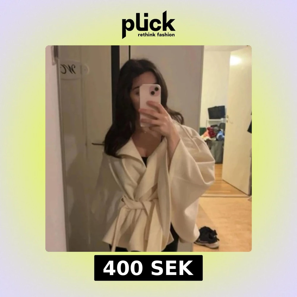 Vit creme poncho med bälte i midjan. Jackan har vida ärmar och en mjuk, slät yta som ger ett elegant intryck. Perfekt för lager-på-lager och enkel att matcha med olika outfits.
