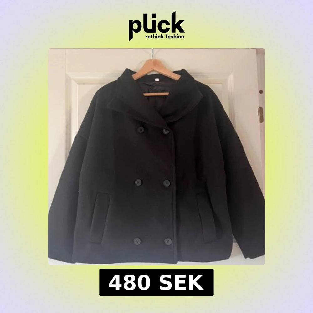 Säljer en svart skepparkavaj med dubbelknäppning och hög krage. Jackan har en loose passform, raka fickor och är tillverkad i ett tjockare ullmaterial. Perfekt för dig som gillar klassisk stil med modern twist.