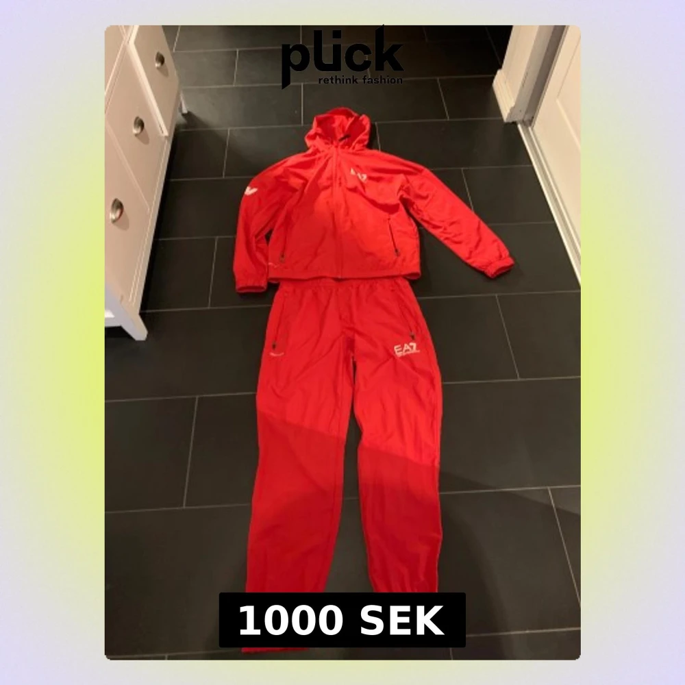 Säljer en röd vindjacka och byxor från EA7 Emporio Armani Storlek M med huva och dragkedja framtill. Jackan har två sidofickor med dragkedja och logga på bröstet och ärmen. Materialet är lätt och syntetiskt, perfekt för att hålla vinden ute. Passar dig som gillar sportig och clean stil.