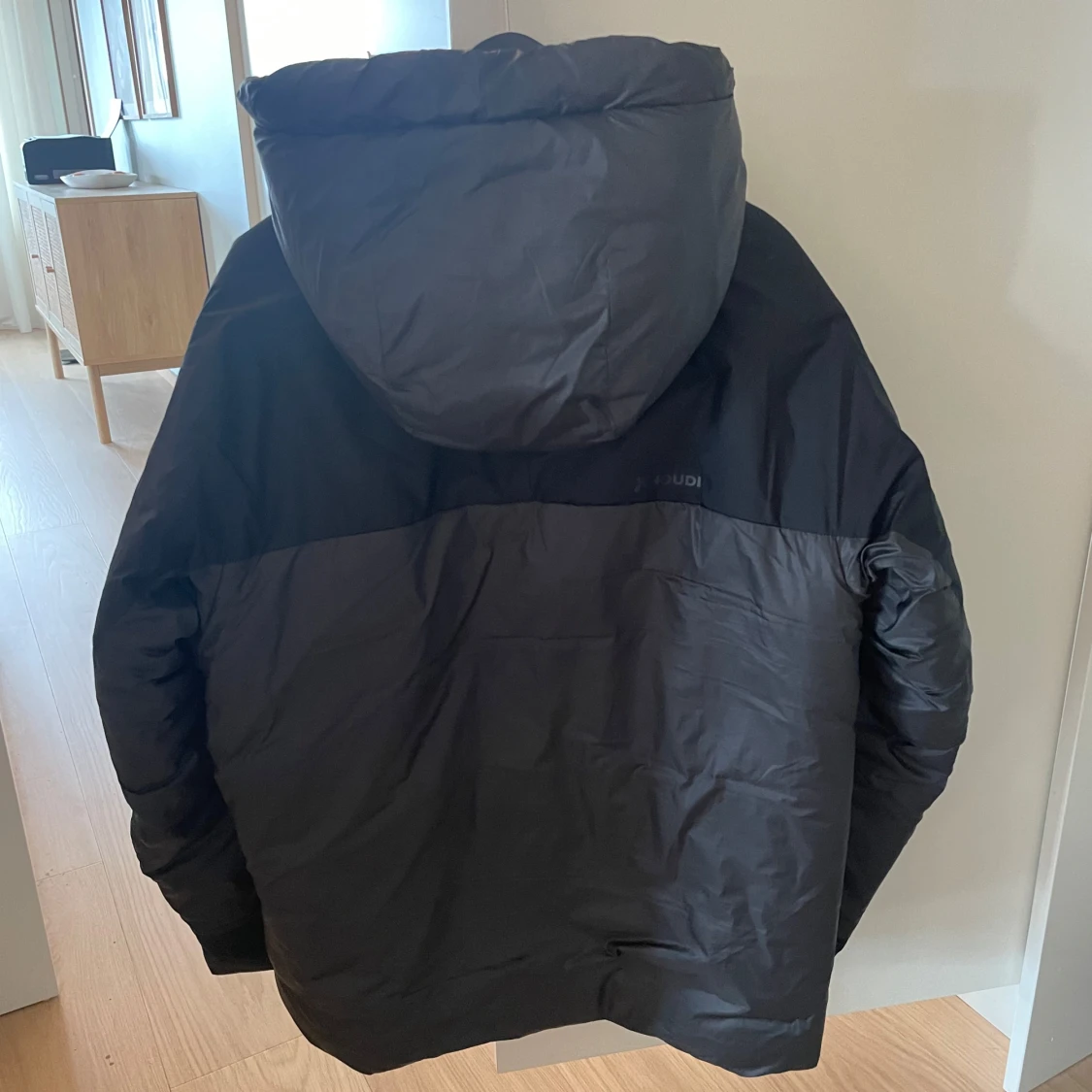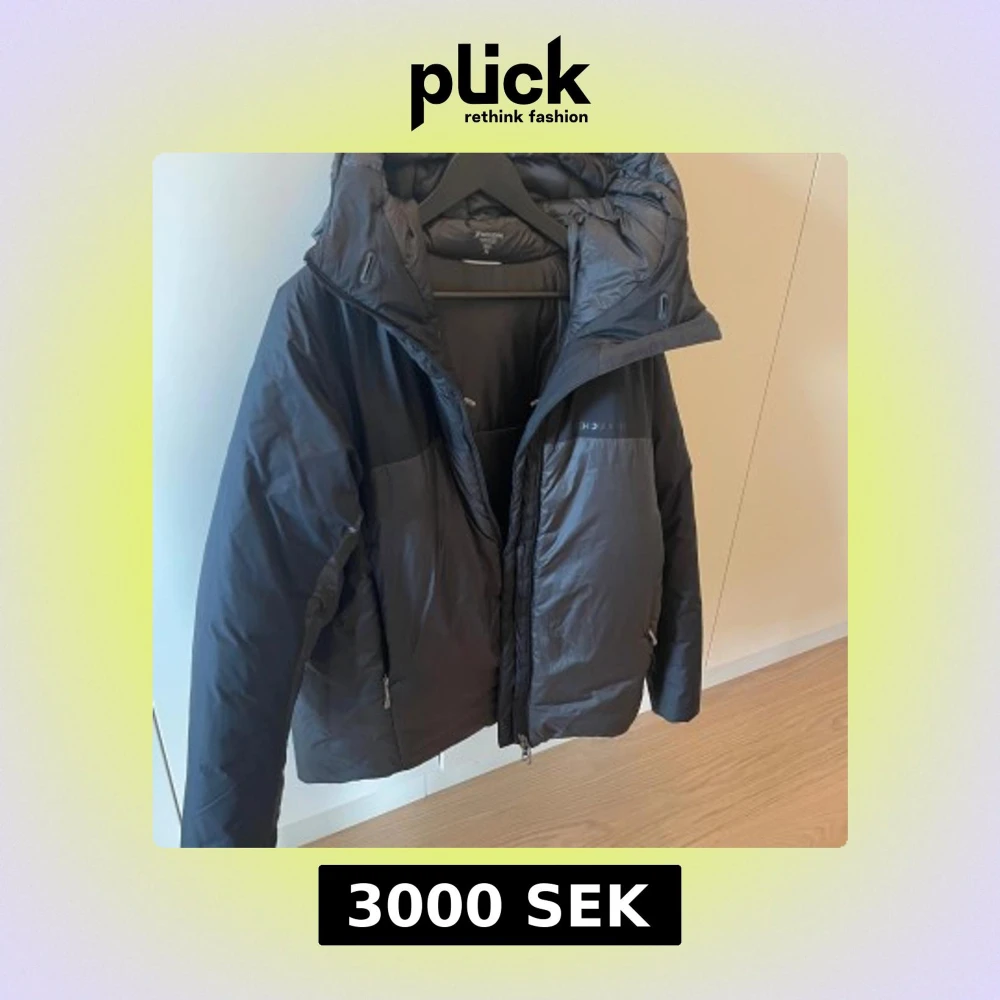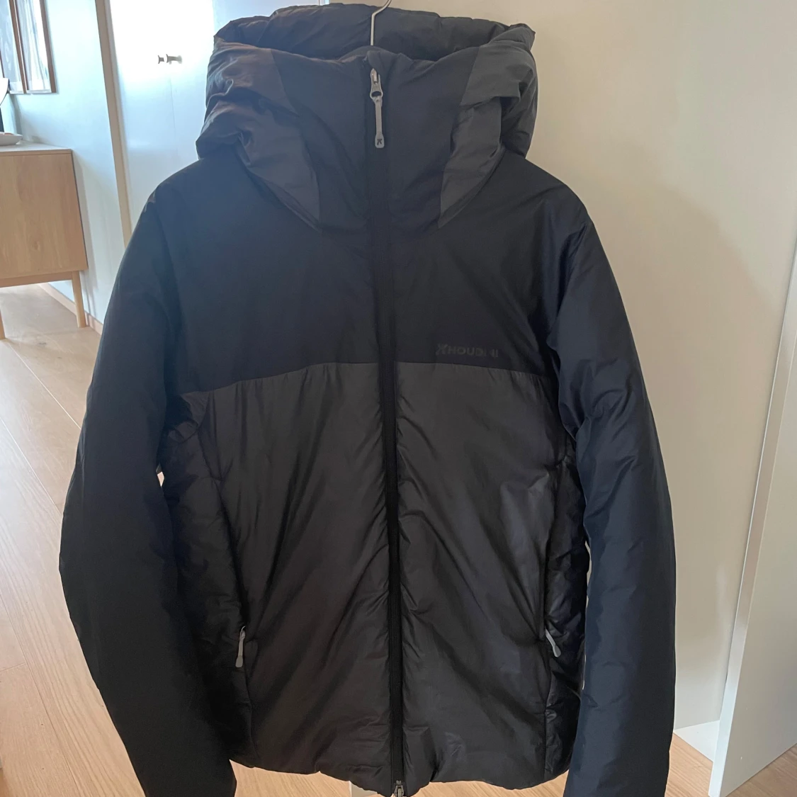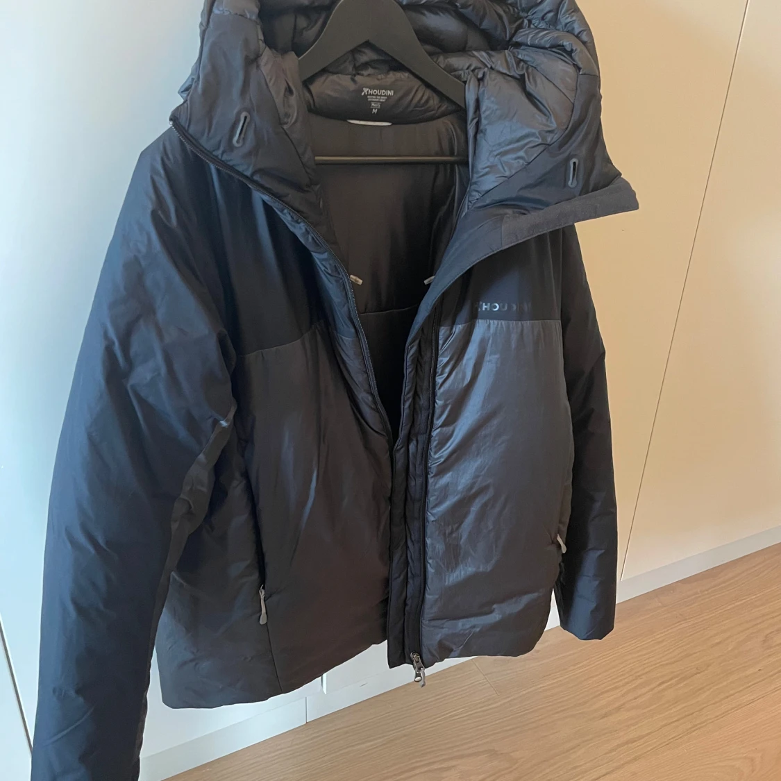 Säljer en svart dunjacka från Houdini med stor, mysig huva och dragkedja framtill. Jackan har en clean look, två sidofickor med dragkedja och är perfekt för kalla dagar. Materialet är lätt och smidigt, vilket gör den enkel att bära och styla till olika outfits.