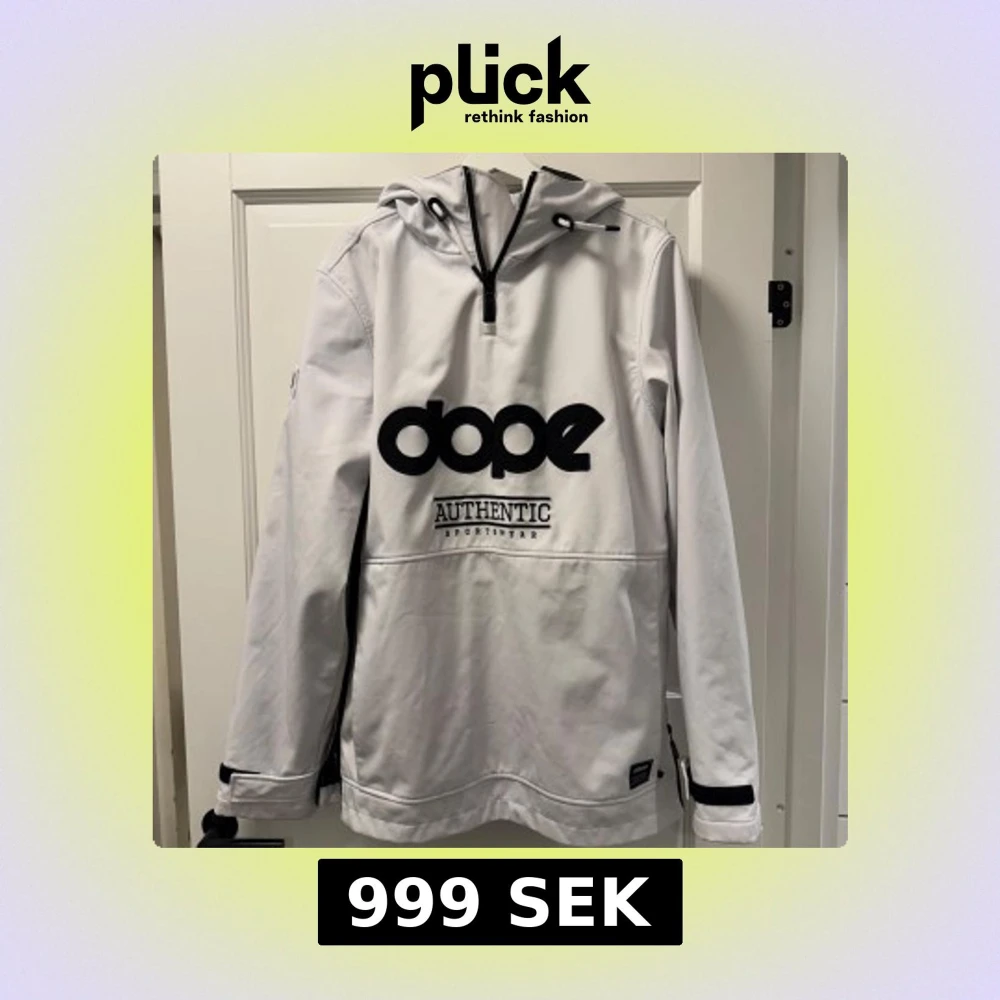 Säljer en stilren vit jacka från Dope med svart logga på bröstet och ärmen. Jackan har en huva och dragkedja på sidan för enkel på- och avtagning. Perfekt för en sportig look.