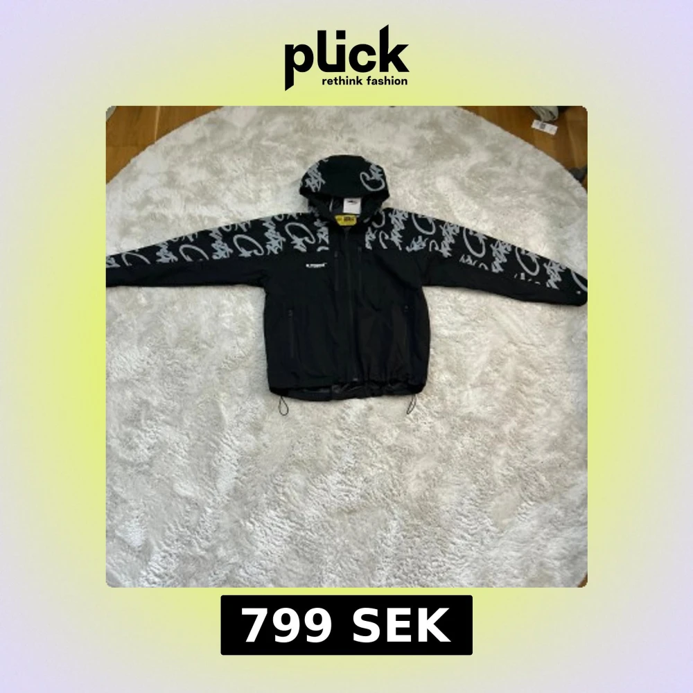 Svart vindjacka från Cortez Guerillaz med huva och coolt grått graffiti-mönster på axlar och ärmar. Jackan har broderad ELITEWORK-logga på bröstet, dragkedja framtill och snörning i nederkant. Perfekt för dig som gillar streetwear och unik stil. Använd ett fåtal gånger! Storlek M men är rätt kort i längden så passar S perfekt också!