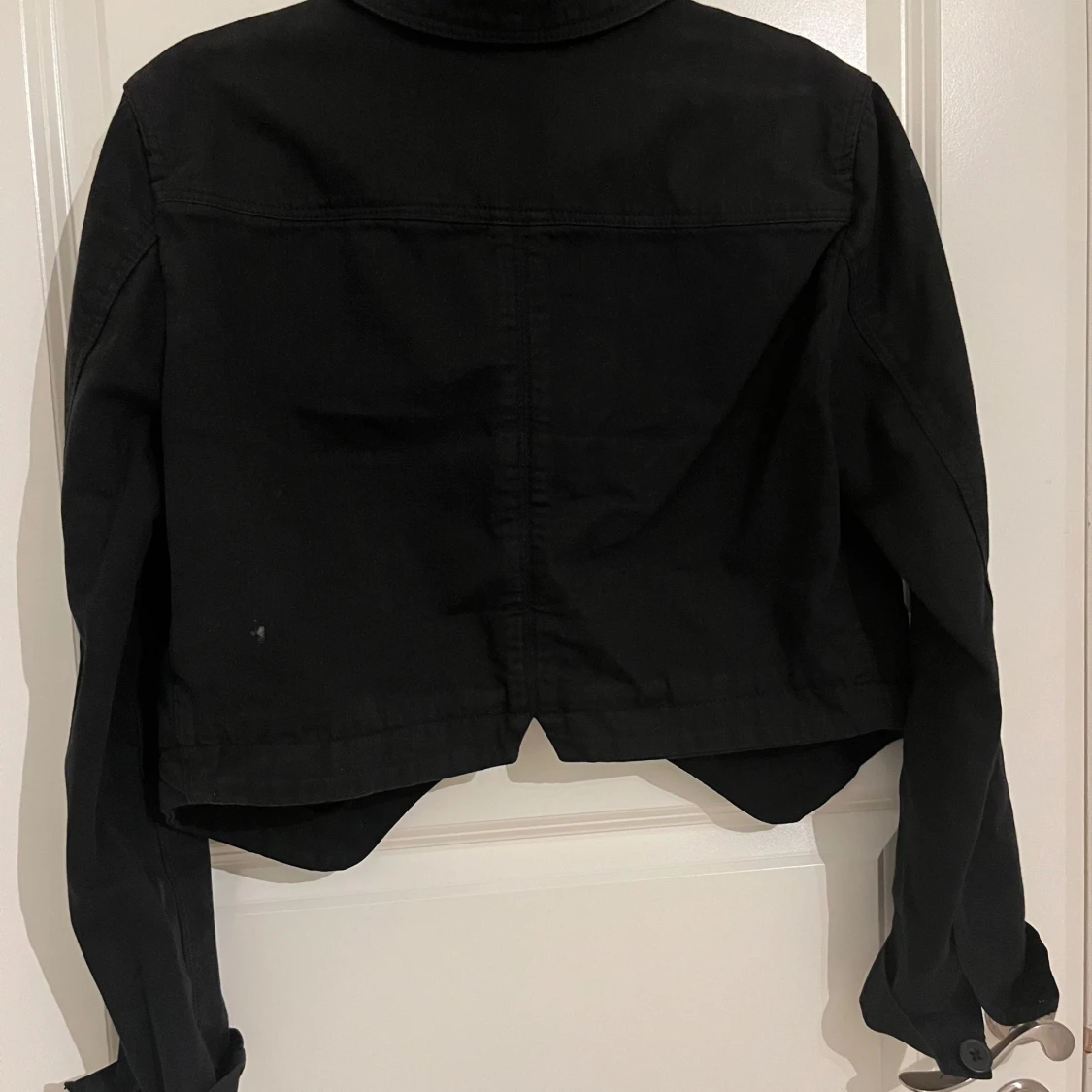 Snygg svart kavajjacka med två knappar framtill och klassisk krage. Jackan har lång ärm och en något croppad passform med lätt markerad midja. Perfekt för dig som gillar stilrena och enkla plagg. Materialet känns som bomull eller en bomullsblandning. Storlek M passar S.