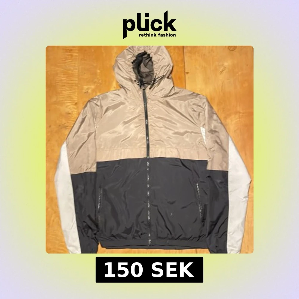 Snygg vindjacka i beige, svart och grått från Fearless Contribution. Jackan har huva med snörning, hel dragkedja framtill och två fickor med dragkedja. Lätt och smidig med meshfoder i huvan, perfekt för blåsiga dagar. Ett litet slitage på justerings snöret där men går säkert att lösa!