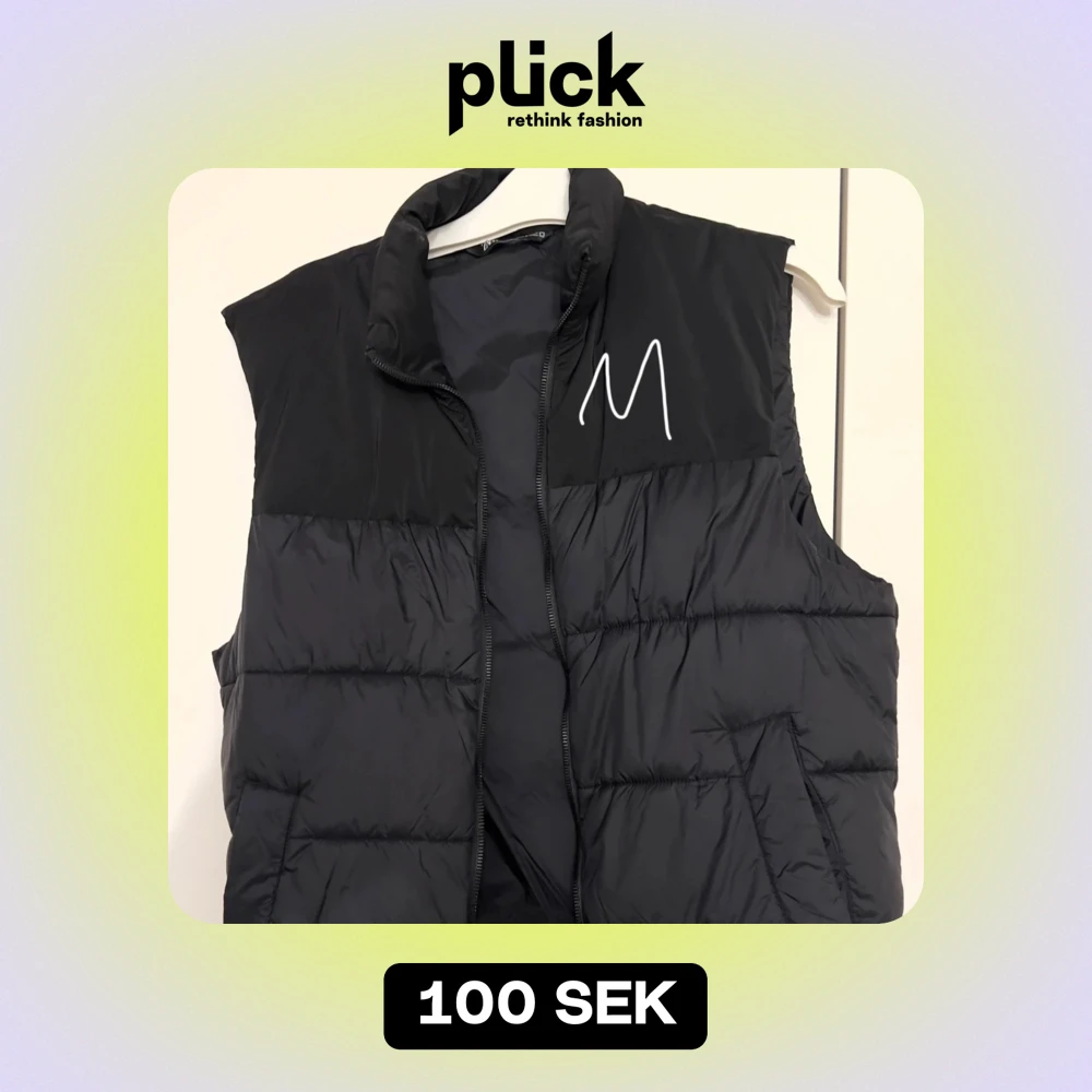 Säljer en svart dunväst med dragkedja och en stilren design. Är perfekt för kyliga dagar. Den är lätt och bekväm att bära, idealisk för både höst och vår. Passar bra till casual outfits.