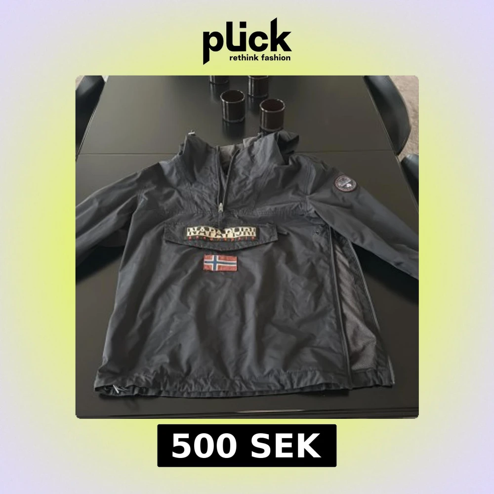 Säljer en svart vindjacka från Napapijri med huva och stor ficka framtill. Jackan har dragkedja upptill, norsk flagga och logga på bröstet samt patch på ärmen. Perfekt för blåsiga dagar och snygg streetstil. Pris kan diskuteras
