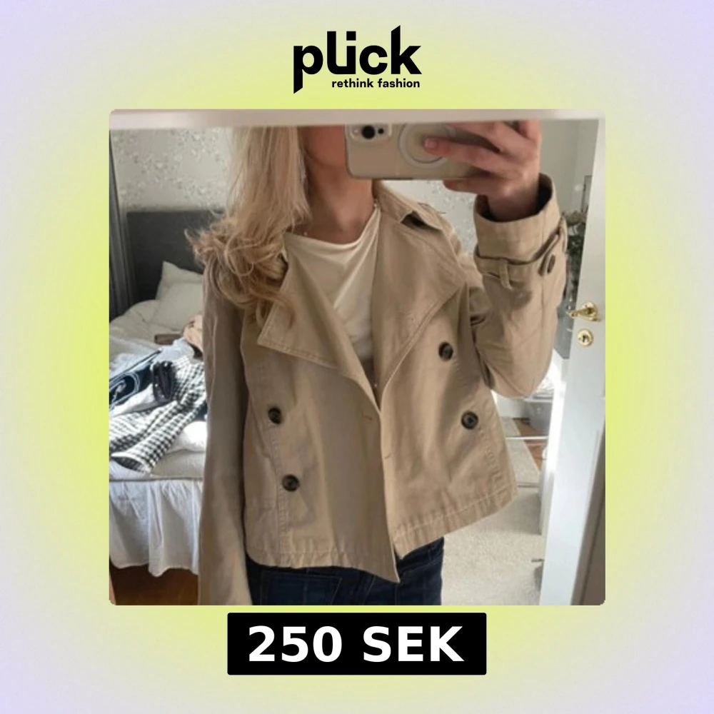Säljer en beige croppad trenchcoat med dubbelknäppning och stora slag. Jackan har långa ärmar och snygga detaljer vid ärmsluten. Är köpt från sellpy för 350kr