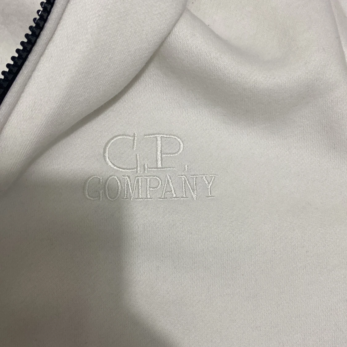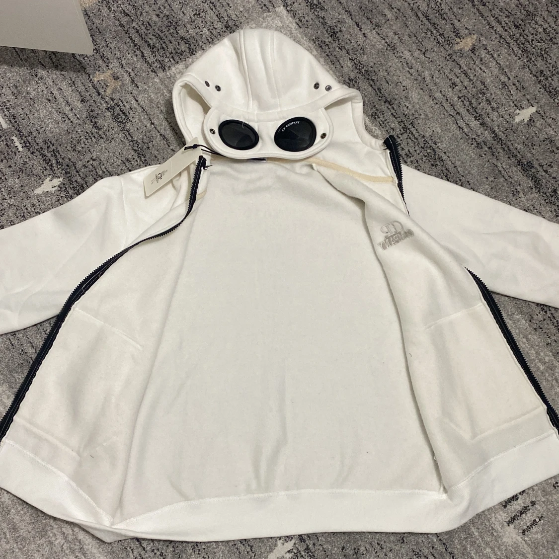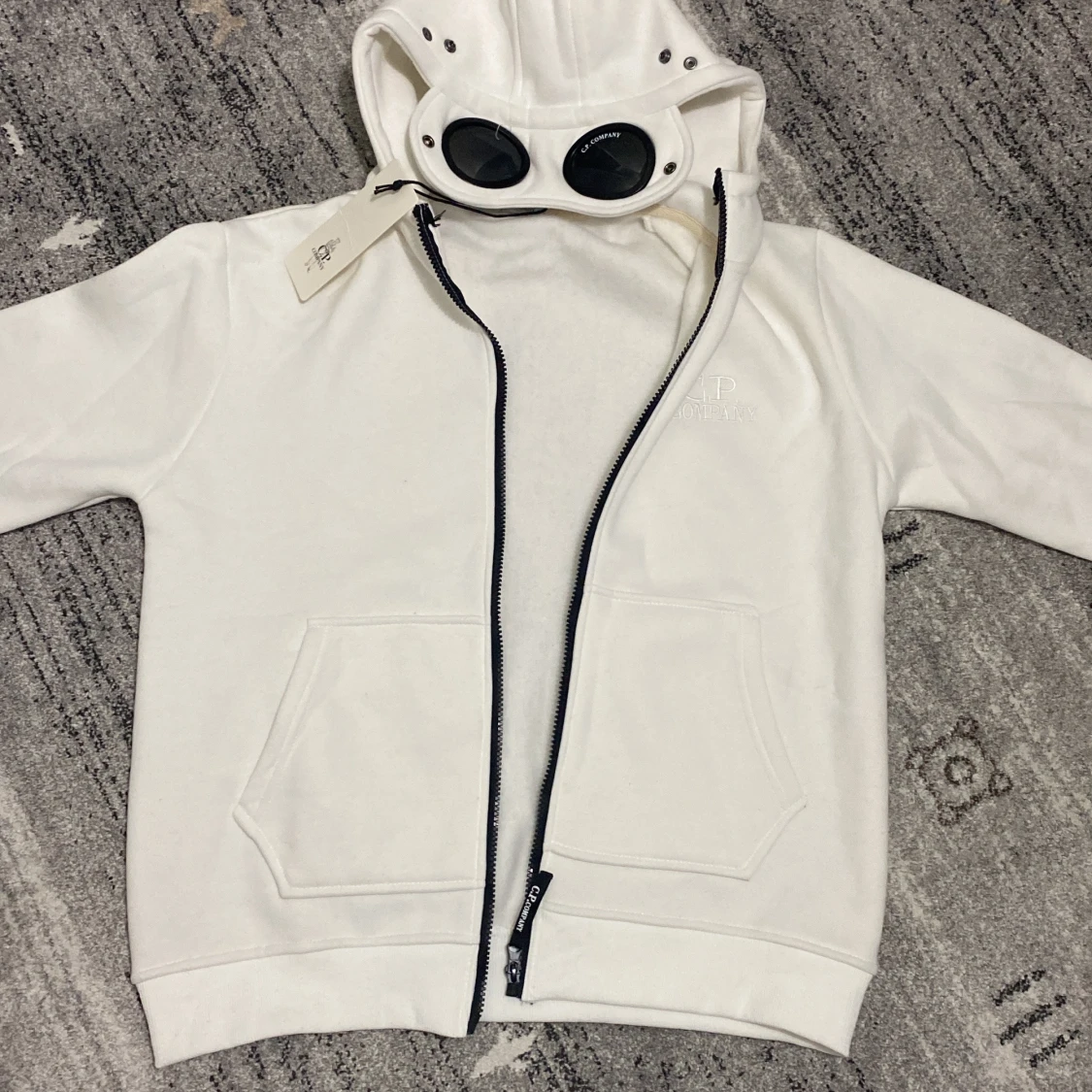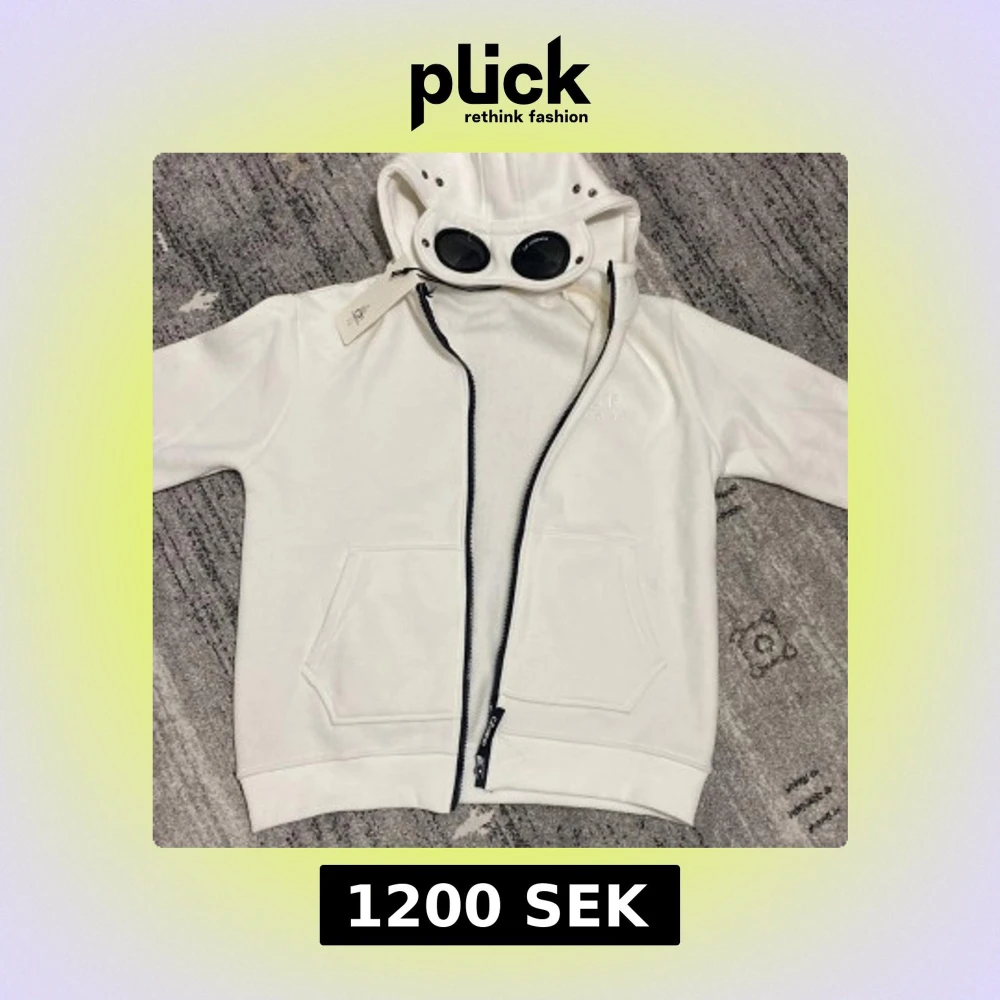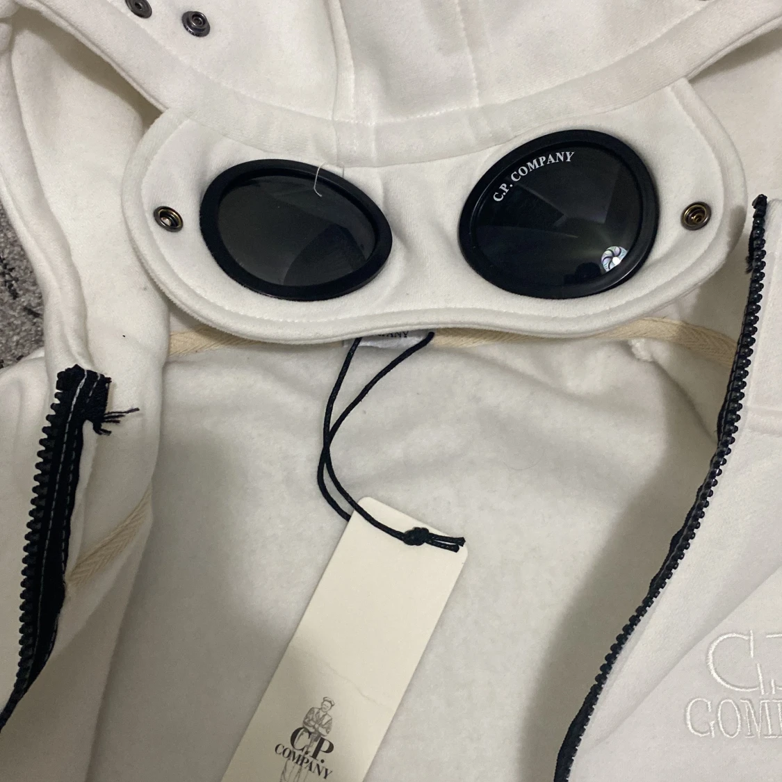 Säljer en cool vit huvtröja från C.P. Company med inbyggda glasögon i huvan. Tröjan har dragkedja framtill och två fickor. Perfekt för en unik stil!