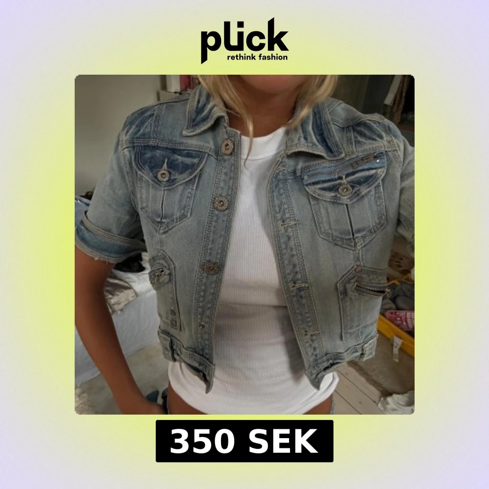 Säljer en ljusblå croppad jeansjacka med korta ärmar och coola detaljer som dekorativa knappar och dragkedjor på fickorna.