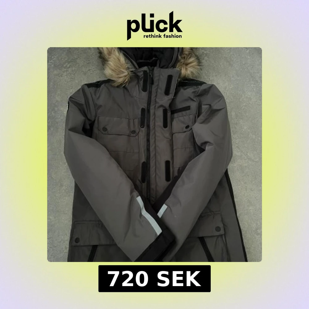 Säljer en grå parkajacka med svart kontrast, reflexdetaljer och huva med fuskpäls. Jackan har flera fickor framtill, dragkedja och tryckknappar. Perfekt för kalla dagar och har en riktigt snygg streetstil. (Pris kan diskuteras vid snabb affär)