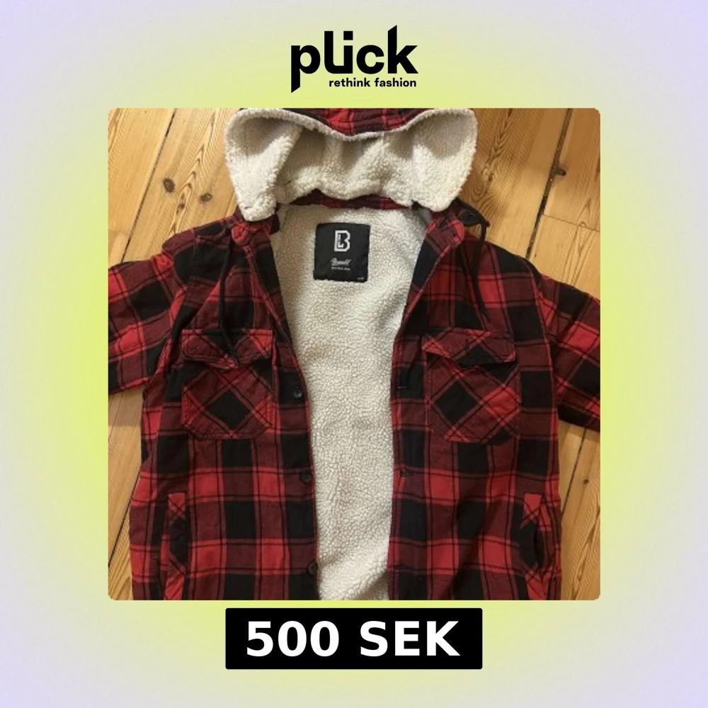 Säljer en röd och svart rutig overshirt, storlek M från Brandit med mysigt vitt teddyfoder och huva. Jackan har knäppning framtill och två bröstfickor.