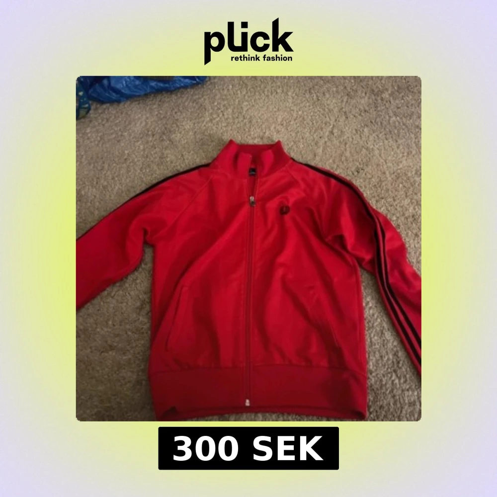 Säljer en klassisk röd track jacket från Fred Perry med svarta ränder längs ärmarna och broderad logga på bröstet. Jackan har dragkedja framtill, ståkrage och ribbade muddar. Perfekt för en sportig och stilren look. Ca Stl M