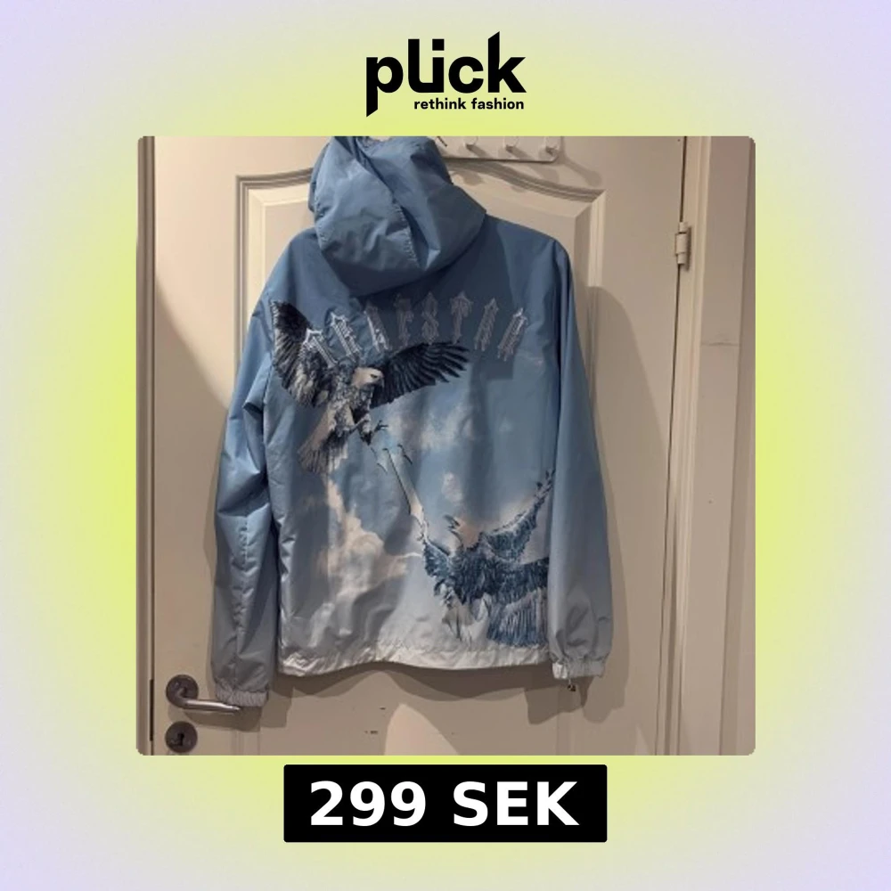 Säljer en blå vindjacka från Trapstar med fett örntryck och moln på både fram och baksidan. Jackan har huva, dragkedja och två fickor med zip.