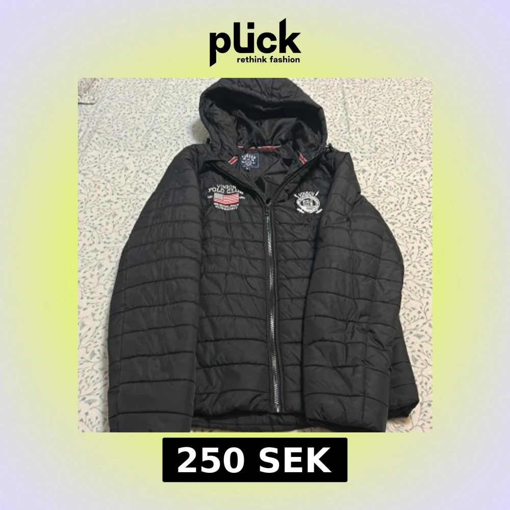 Svart pufferjacka från Vinson Polo Club med broderade detaljer på bröstet, inklusive klubbens logga och amerikansk flagga. Jackan har huva, dragkedja framtill och quiltad design. Perfekt för dig som gillar sportig och clean stil.