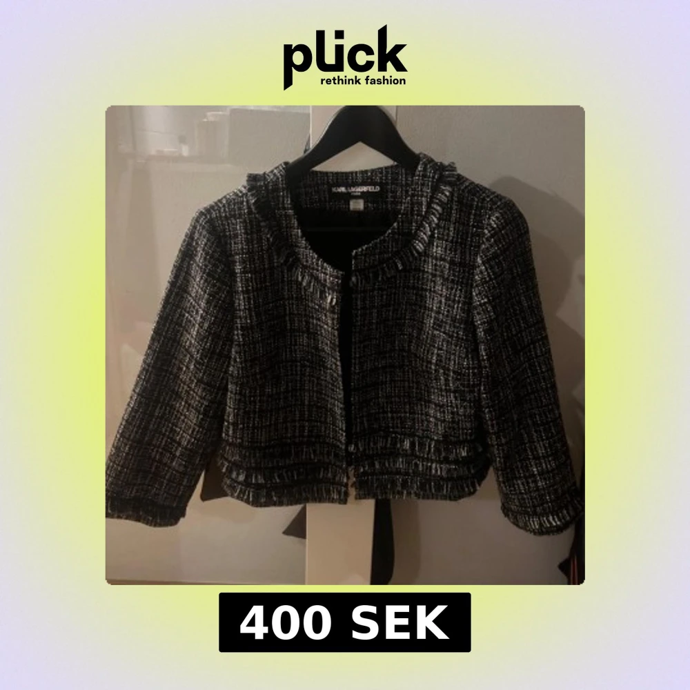 Elegant svartvit kavaj från Karl Lagerfeld med ett klassiskt rutigt mönster. Kavajen har en chic, croppad design med dekorativa fransdetaljer vid kragen och nederkanten. Perfekt för en stilfull look.