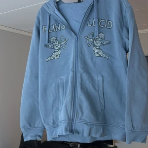 Säljer en blå hoodie med dragkedja och huva från Lucid. Den har blingdetaljer med texten 'BLING LUCID' och två änglar på framsidan. Perfekt för en cool och avslappnad stil.
