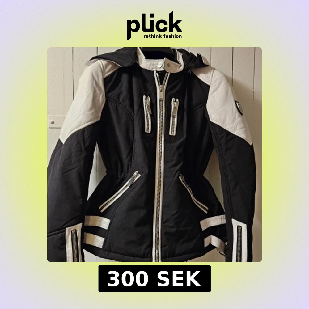 Säljer en svart och vit jacka från Horspist Paris med flera dragkedjor och snygga detaljer. Jackan har huva, markerad midja och vita partier på axlar, ärmar och rygg. Märkeslogga på ärmen och coola bältesdetaljer bak. Jackan är liten i storleken-motsvarar mindre S. Luvan är avtagbar och har stor päls om det önskas.