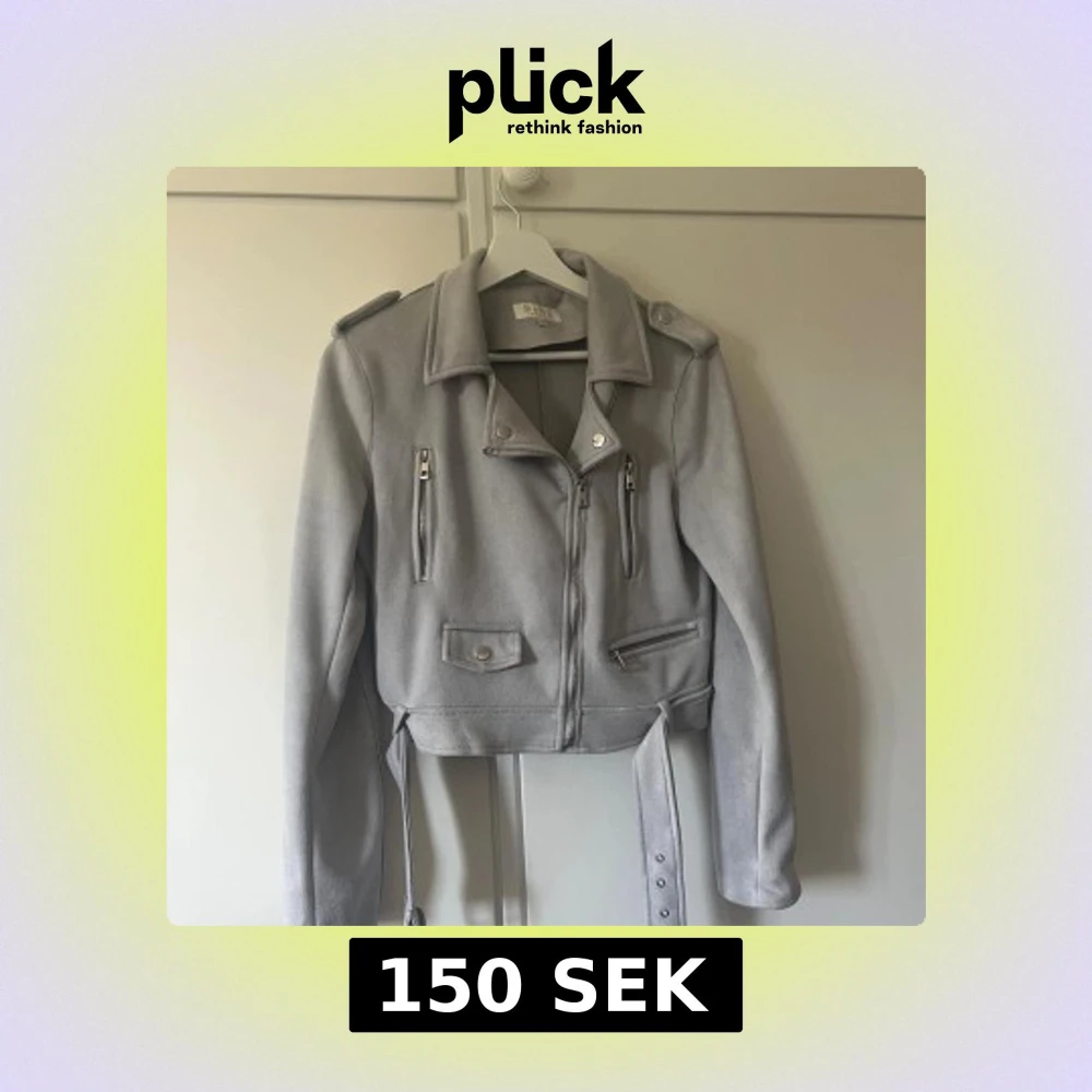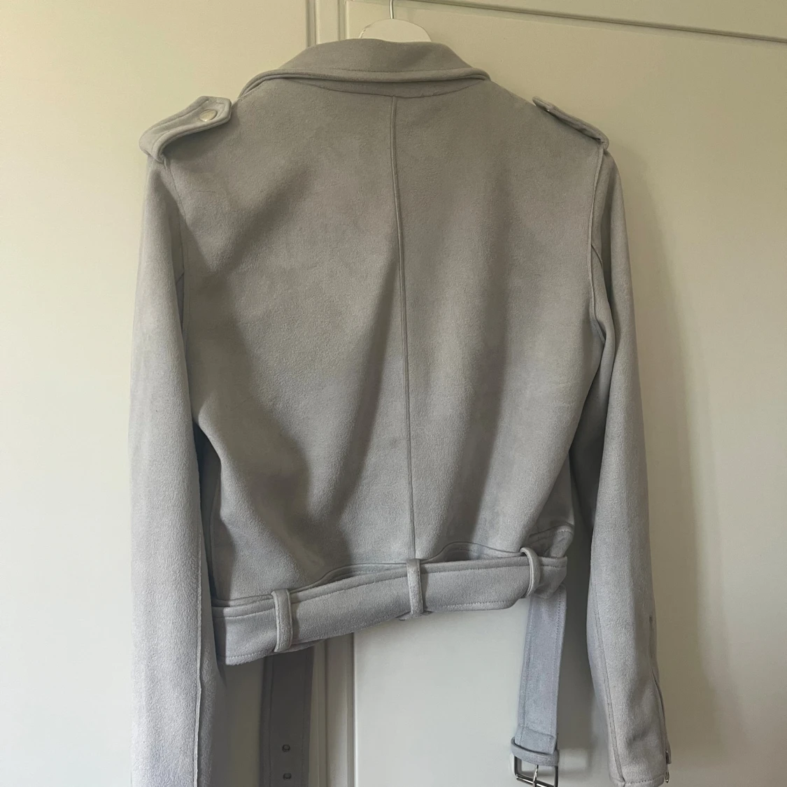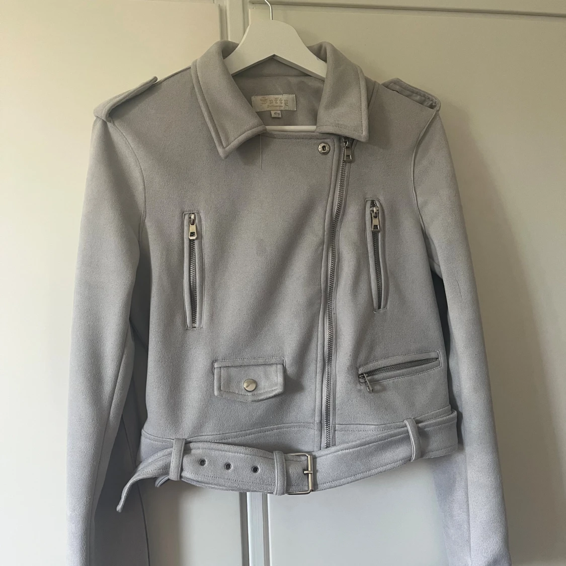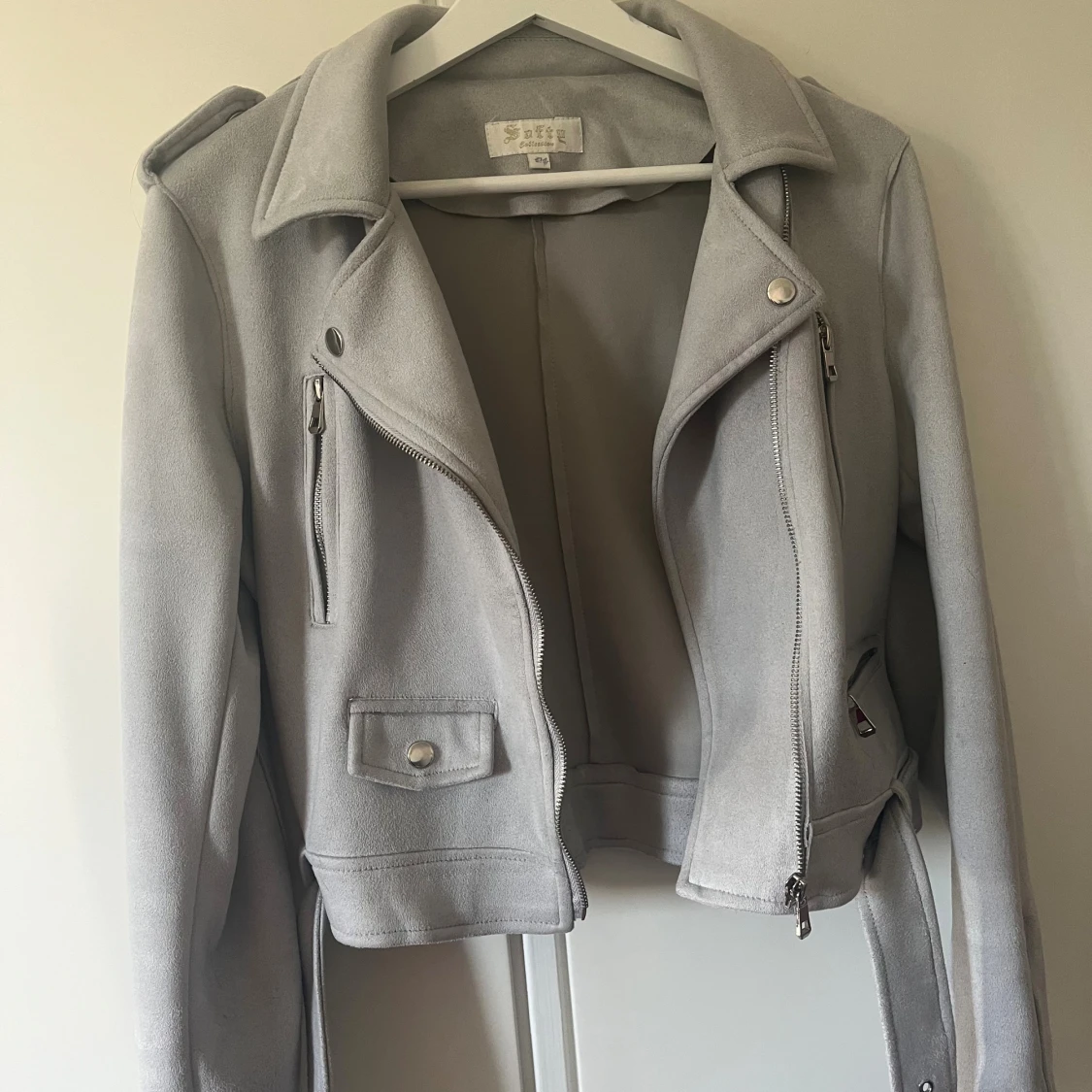 Snygg ljusgrå bikerjacka med klassisk krage, axelklaffar och flera dragkedjor framtill. Jackan har bälte i midjan och är tillverkad i mjukt material som ger en cool look. Perfekt för dig som vill ha en stilren och trendig jacka.