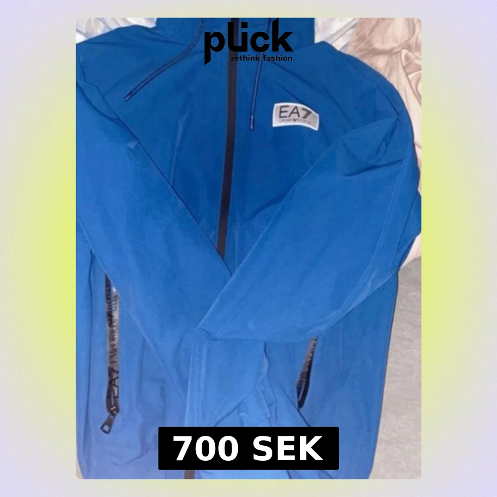 Snygg blå vindjacka från EA7 Emporio Armani med svart dragkedja och logga på bröstet. Jackan har huva med snörning och långa ärmar. Perfekt för dig som vill ha en stilren och sportig look.