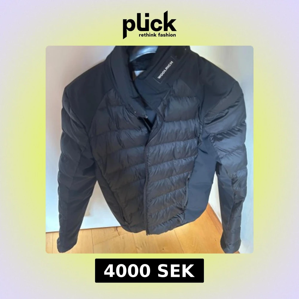 Säljer en svart dunjacka från Woolrich med quiltad design och dragkedja. Jackan har hög krage och lång ärm, perfekt för kyligare dagar. Snygg och stilren modell som passar till mycket.