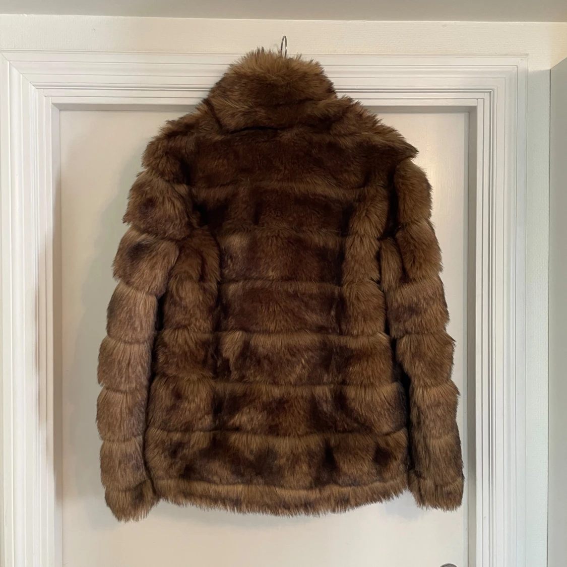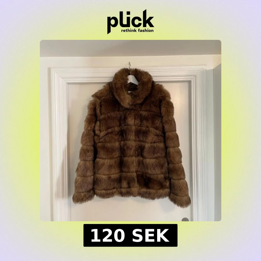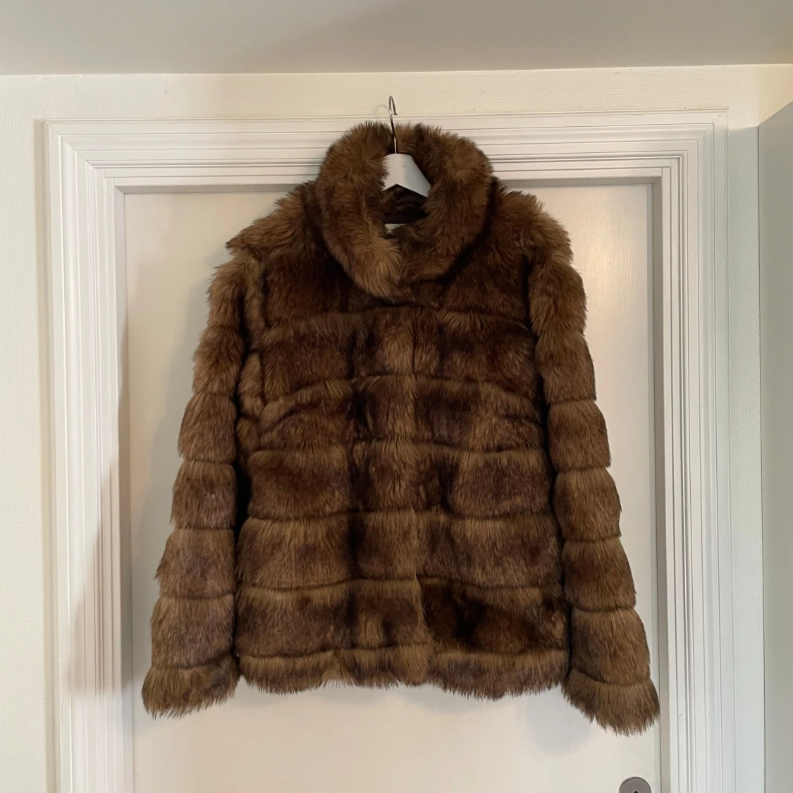 Säljer en brun pälsjacka med fluffig känsla och hög krage. Jackan har ett stilrent snitt och långa ärmar, perfekt för kalla dagar. Den är helbrun och har en klassisk look som passar till många outfits.