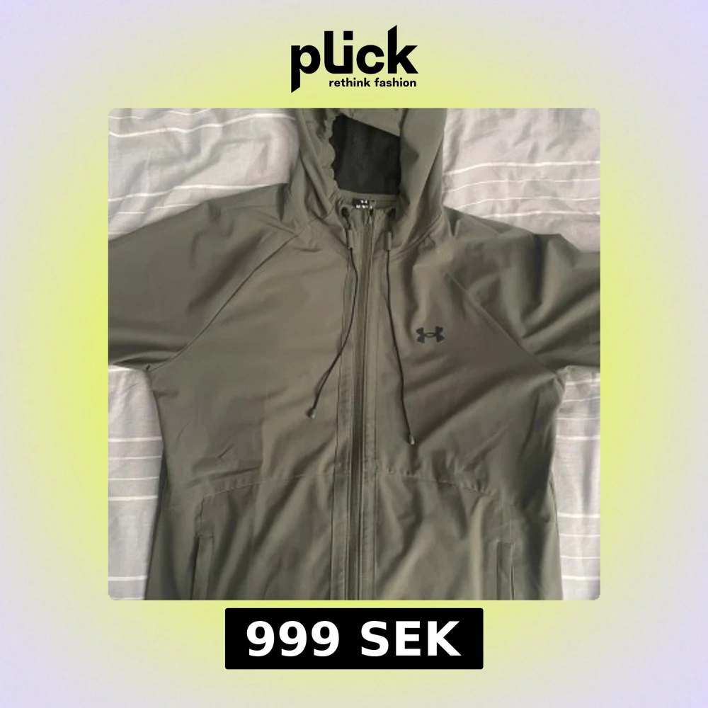 Säljer en olivgrön vindjacka från Under Armour med huva och dragkedja framtill. Jackan har två sidofickor och justerbar dragsko vid huvan. Perfekt för utomhusaktiviteter och träning.