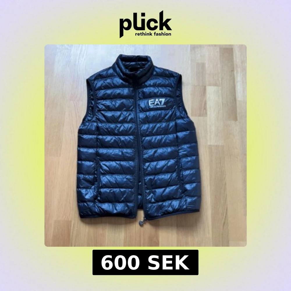Snygg svart dunväst från Emporio Armani med dragkedja och hög krage. Perfekt för kyligare dagar och ger en stilren look. Västen har ett EA7-märke på bröstet och quiltad design.