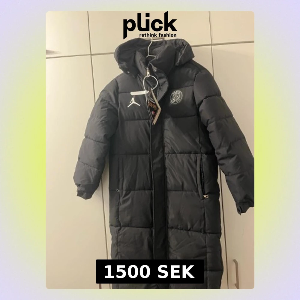Säljer en svart lång dunjacka från Jordan x PSG med huva och vita loggor på bröstet. Jackan har quiltad design, dragkedja framtill och två sidofickor med dragkedja. Perfekt för kalla dagar och har en clean streetstyle-look.