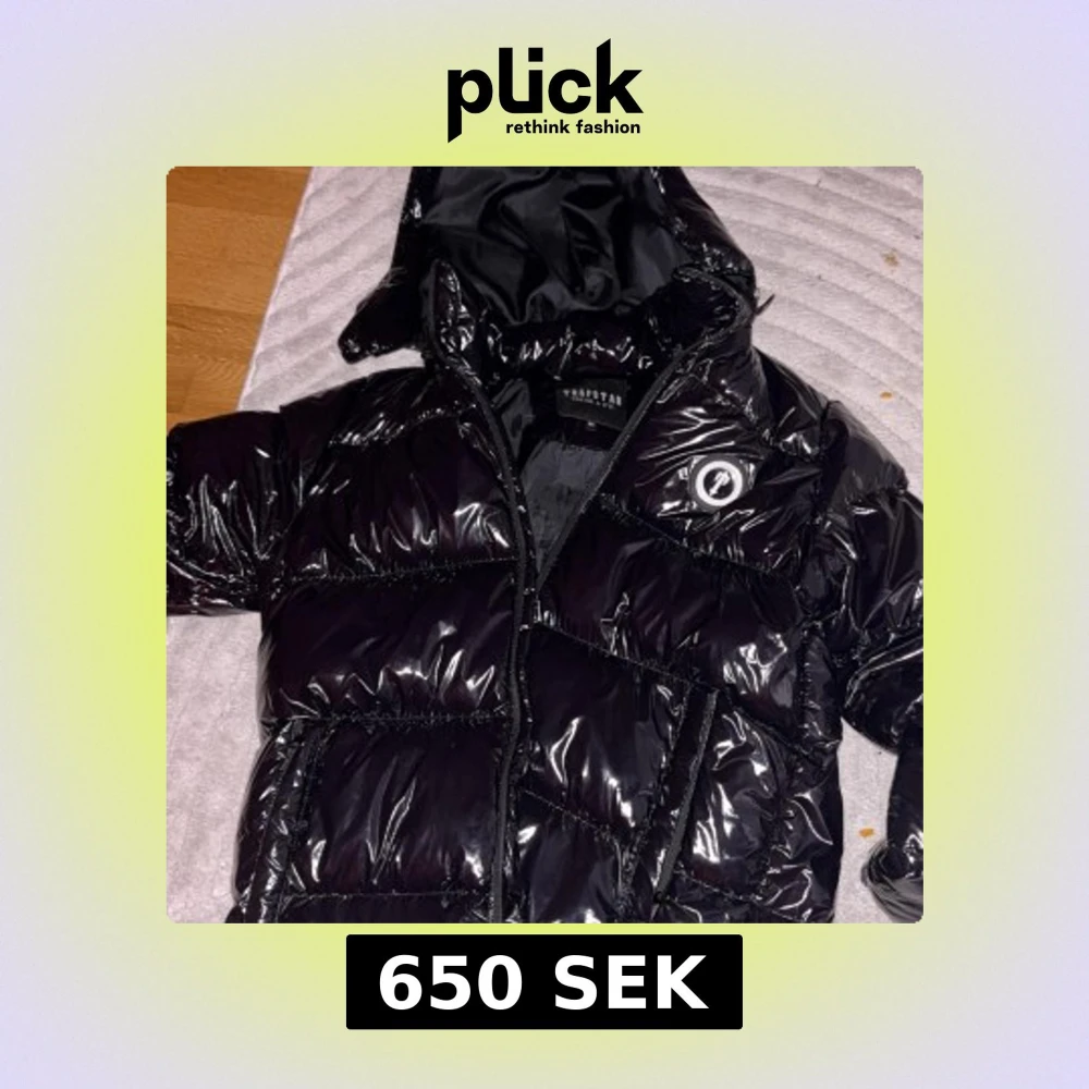 Säljer en svart, glansig pufferjacka från Trapstar i storlek M. Jackan har huva, dragkedja och broderad Trapstar-logga på ryggen. Feta paneler och coolt emblem på bröstet ger jackan en streetwear-vibe. Perfekt för kalla dagar.