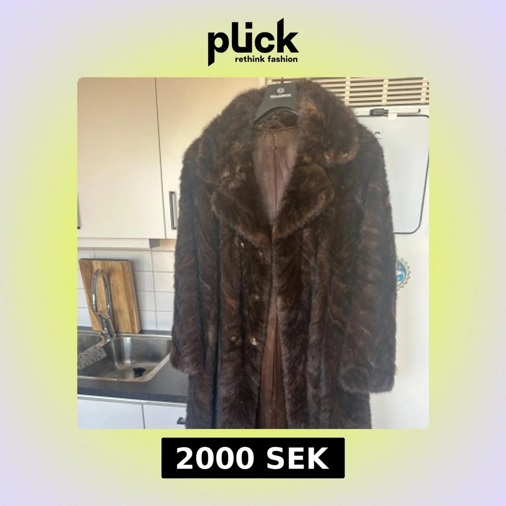 Säljer en lång, mörkbrun mink pälsjacka med bred krage och knappar framtill. Vintage