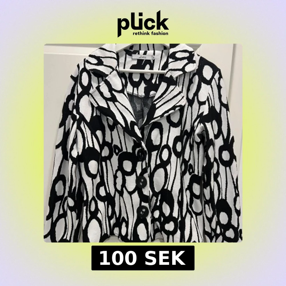 Snygg svartvit kavaj från Z.Biz med unikt grafiskt mönster och stora knappar framtill. Jackan har klassisk krage och lång ärm, perfekt för dig som vill sticka ut med en cool och modern look.