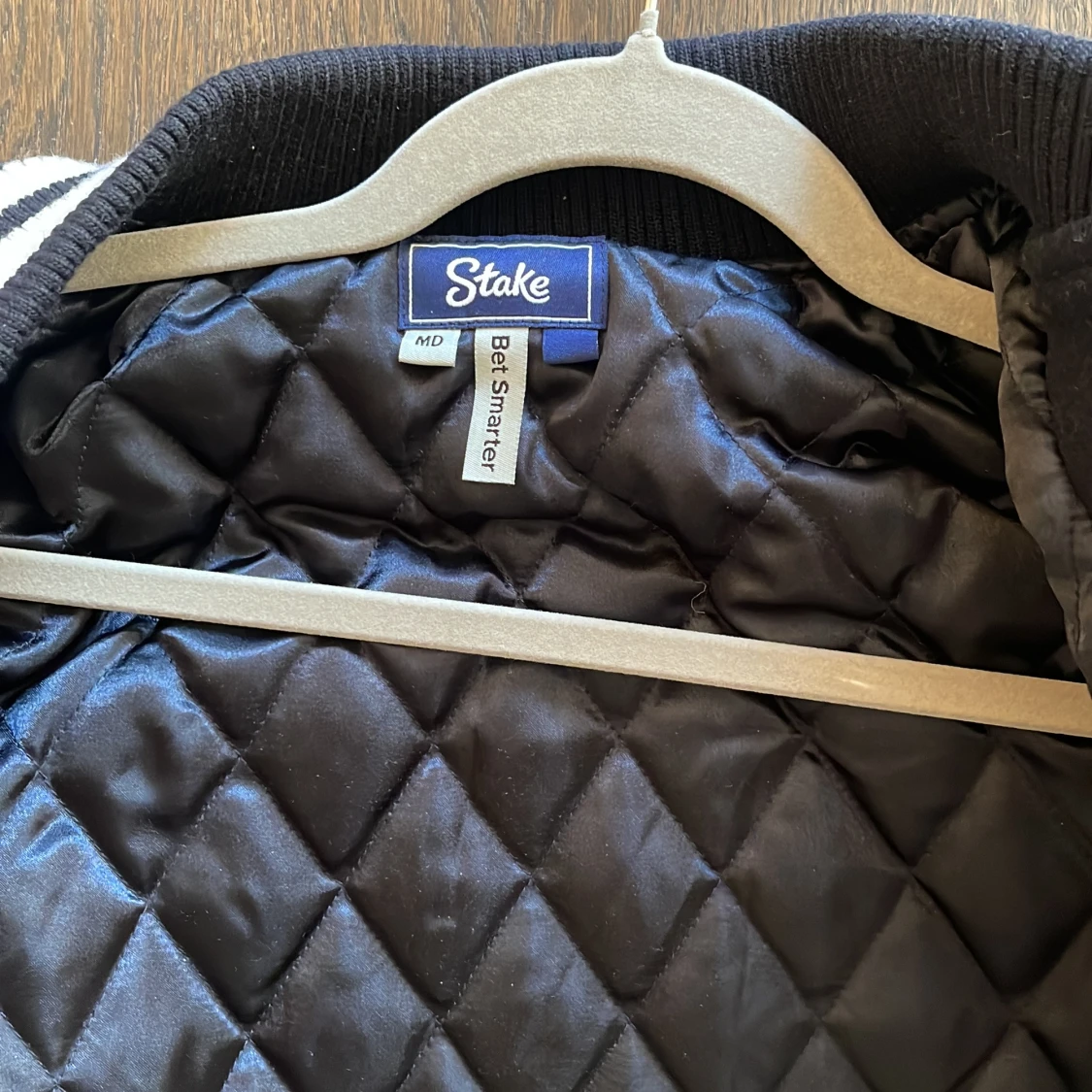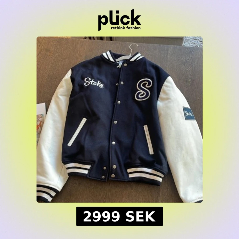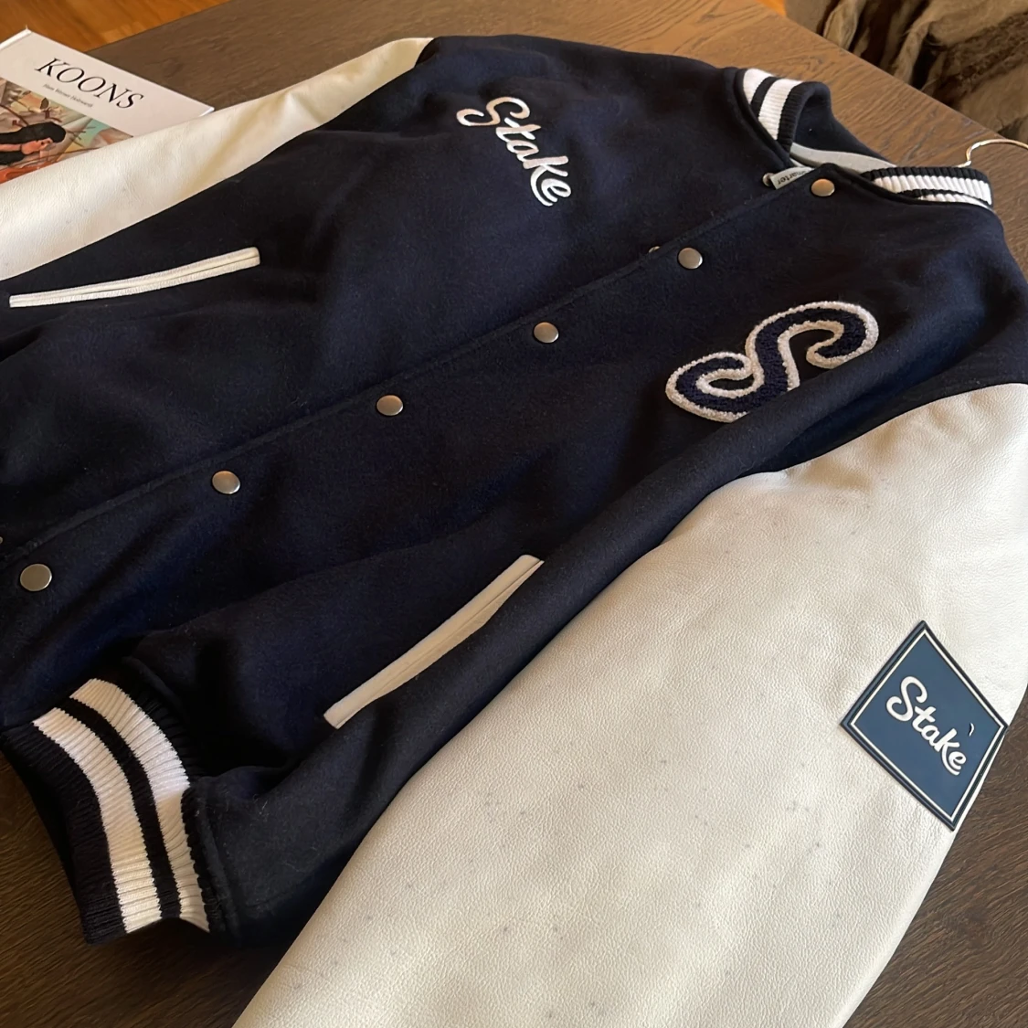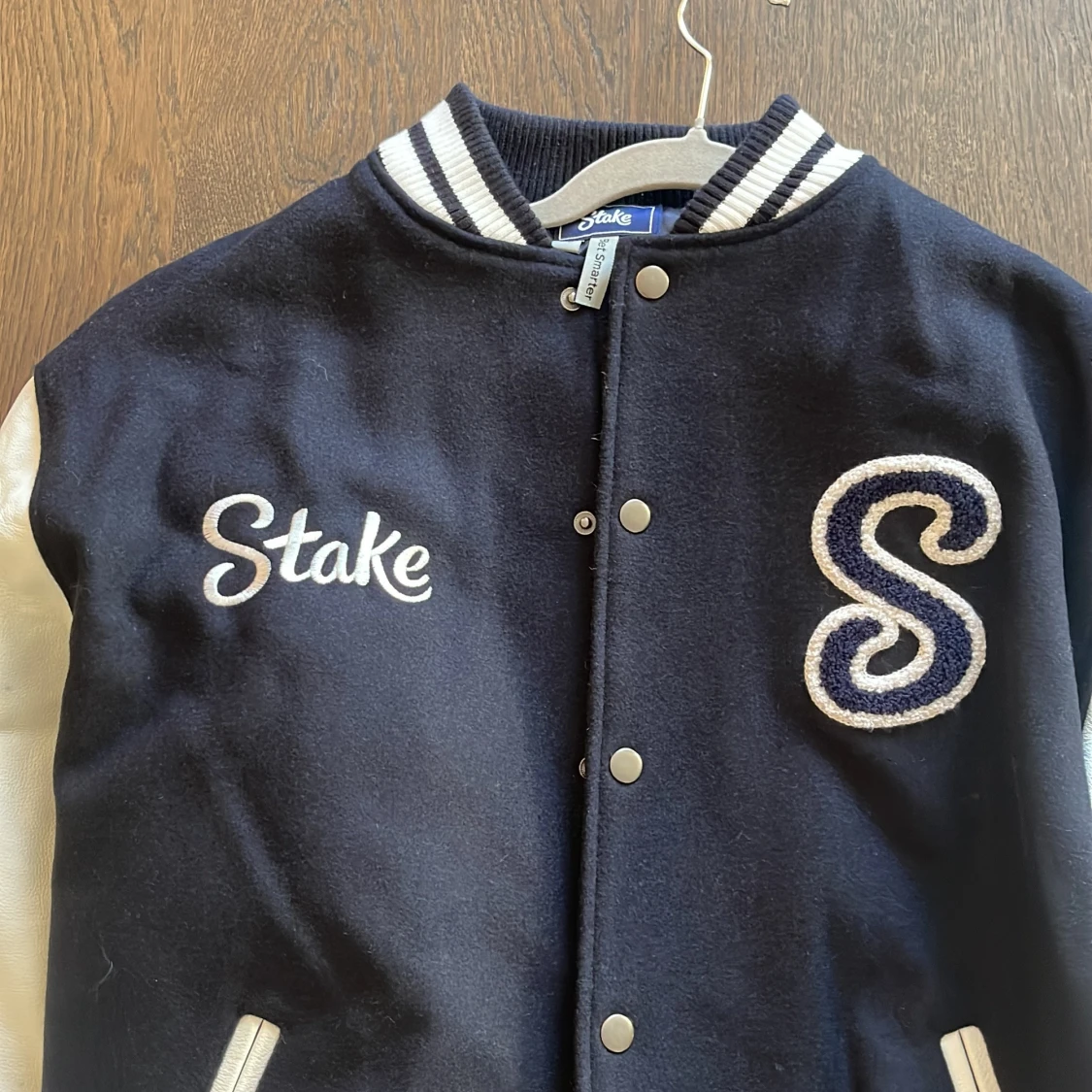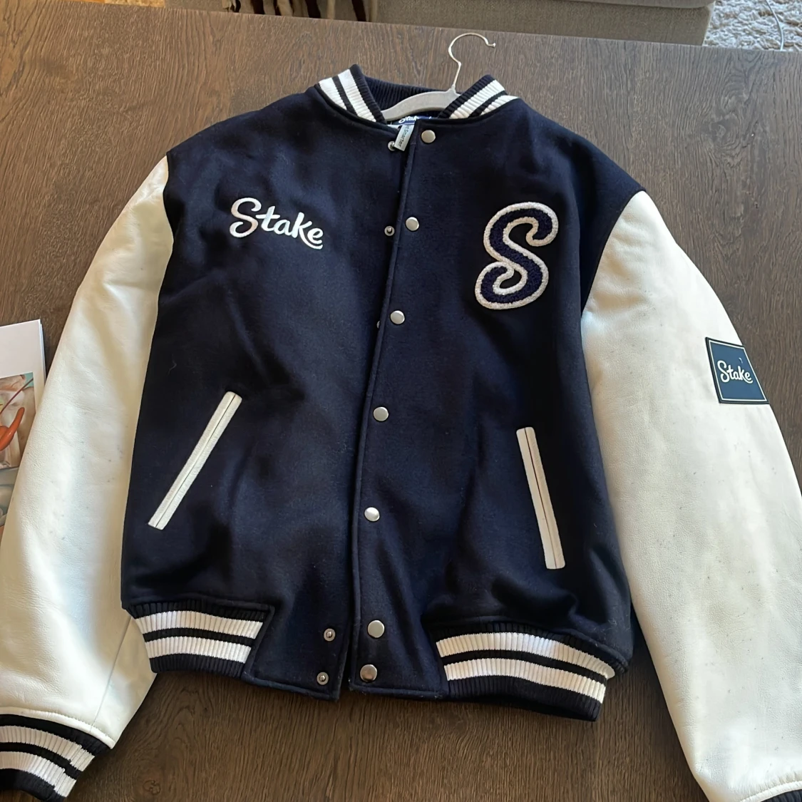 En oanvänd exklusiv bomberjacka från Stake i mörkblått med vita ärmar och detaljer. Jackan har broderad logga och stort S på bröstet, quiltat foder och ribbade muddar med vita ränder. Yttermaterialet är ull och ärmarna i skinn, med knappar framtill och två fickor. Limited Edition - Drake & Stake