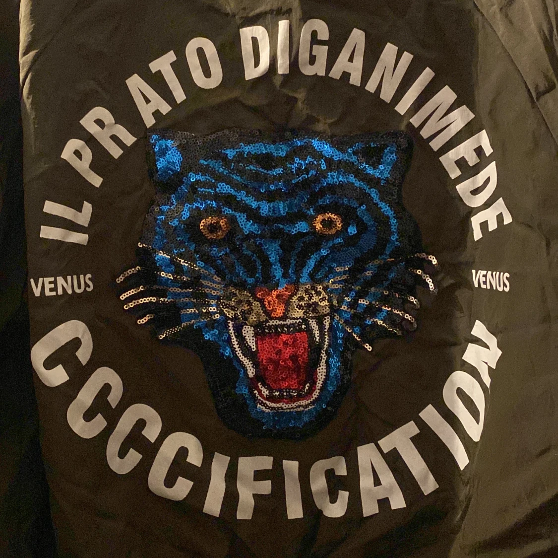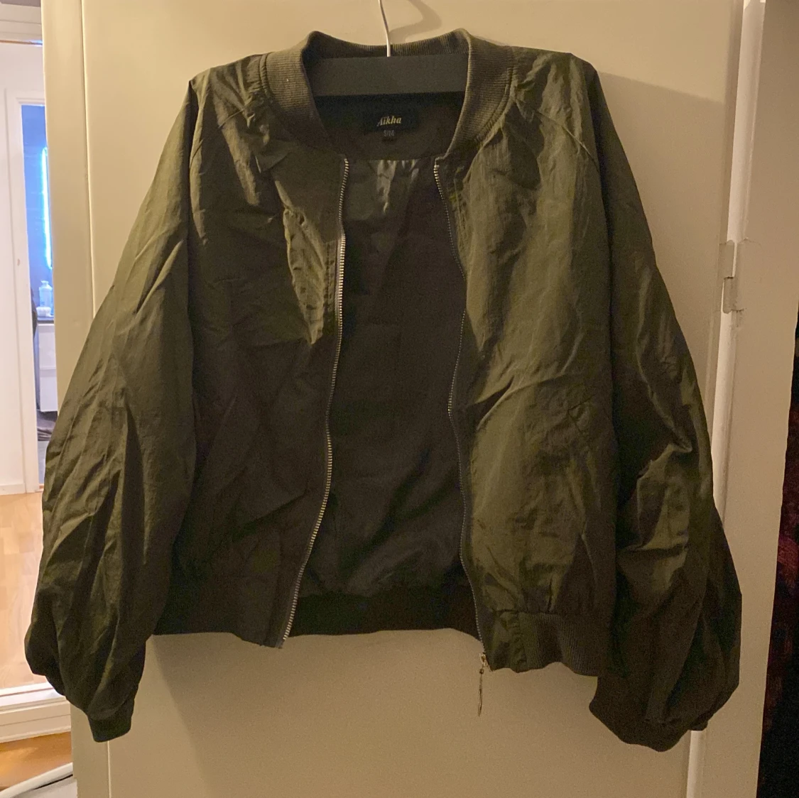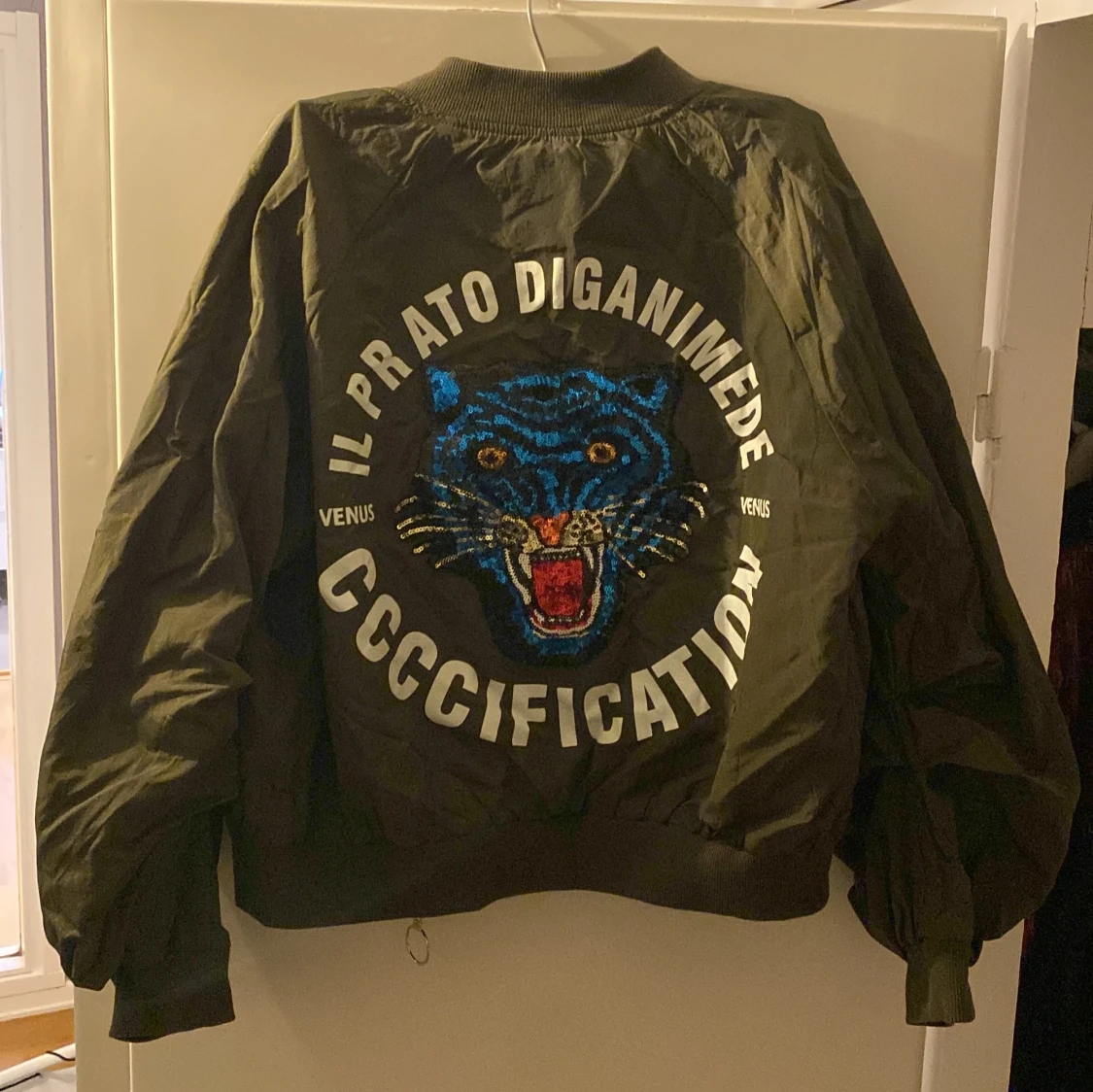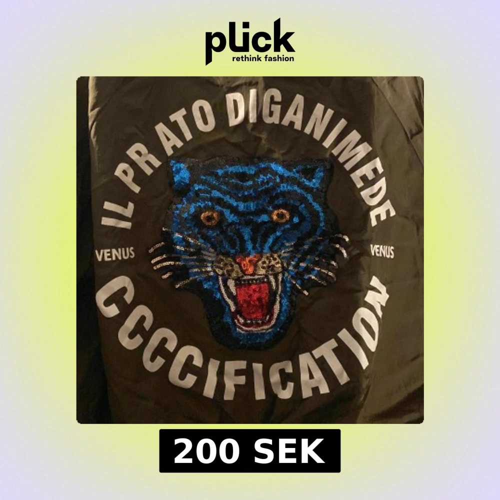 Snygg mörkgrön bomberjacka med en paljettdetalj med blått djurmotiv på ryggen. Jackan har dragkedja framtill och ribbade muddar vid ärmslut och nederkant. Storlek S/M. Pris kan diskuteras!