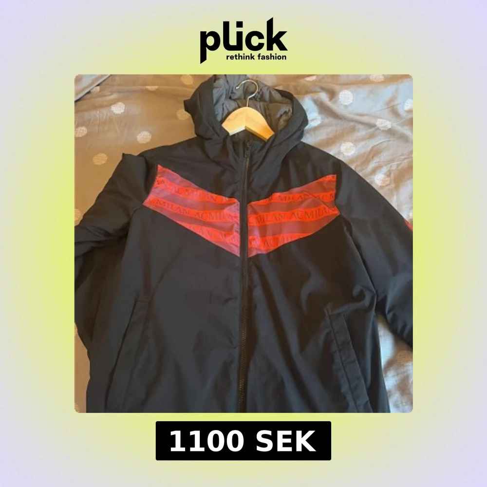 Svart vindjacka från AC Milan med röda detaljer och logga på ärmen. Jackan har huva, hel dragkedja och röda ränder med AC Milan-tryck över bröstet. Insidan har svart-röda ränder. Perfekt för dig som gillar fotboll och vill ha en sportig stil.