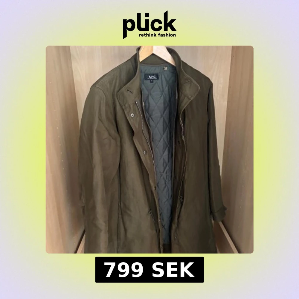 Snygg olivgrön jacka från A.P.C.. Det går även att koppla bort luvan på jackan som man ser på för och efter bild. Priset kan diskuteras!