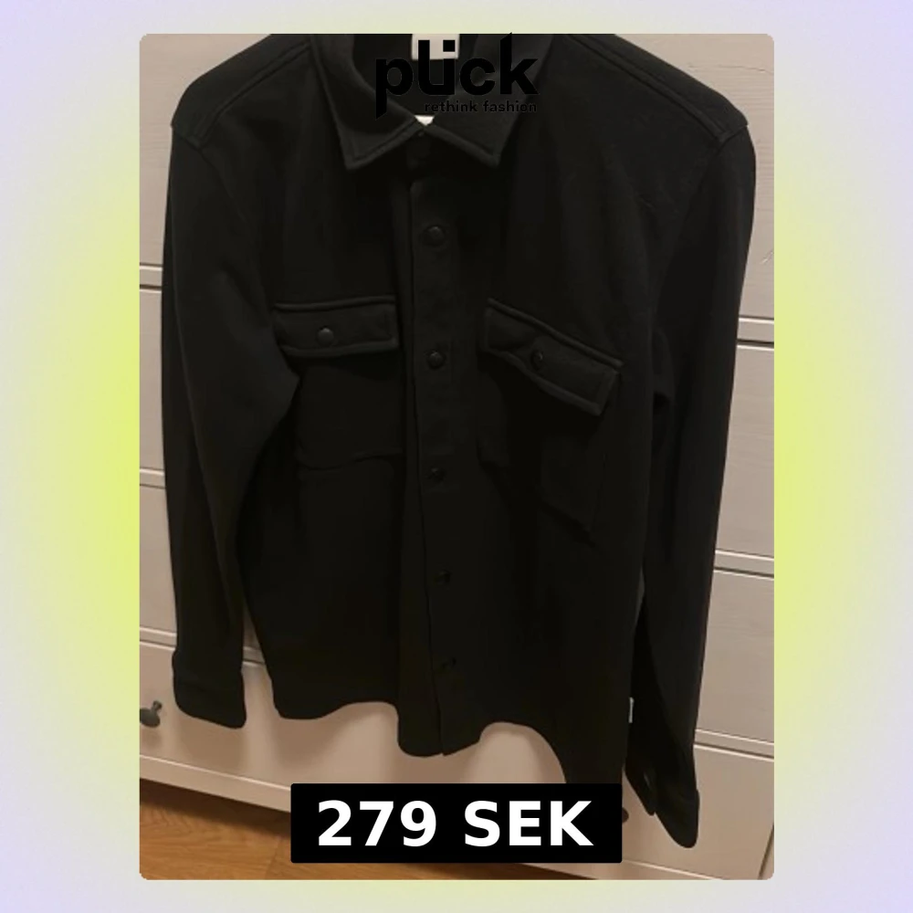 Stilren svart overshirt med klassisk krage och två stora bröstfickor med knappar. Jackan har långa ärmar och knäppning framtill. Perfekt för lager-på-lager och enkel att matcha med olika outfits.