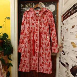 Mycket fin kappa med kapuschong i grov bomull av märket danska märket Danefæ. Röda fåglar på rosa botten. Skiftningen i tyget på bilden beror på hur ljuset bakom mig faller in genom fönstret. Försiktigt använd. Hel och ren. Dragkedja och stora knappar som dekoration och funktion. Dragsko i hög midja. Hämtas i Hägerstensåsen eller i centrala Stockholm enligt överenskommelse. Prutmån finns ej. Swish eller kontanter vid betalning.