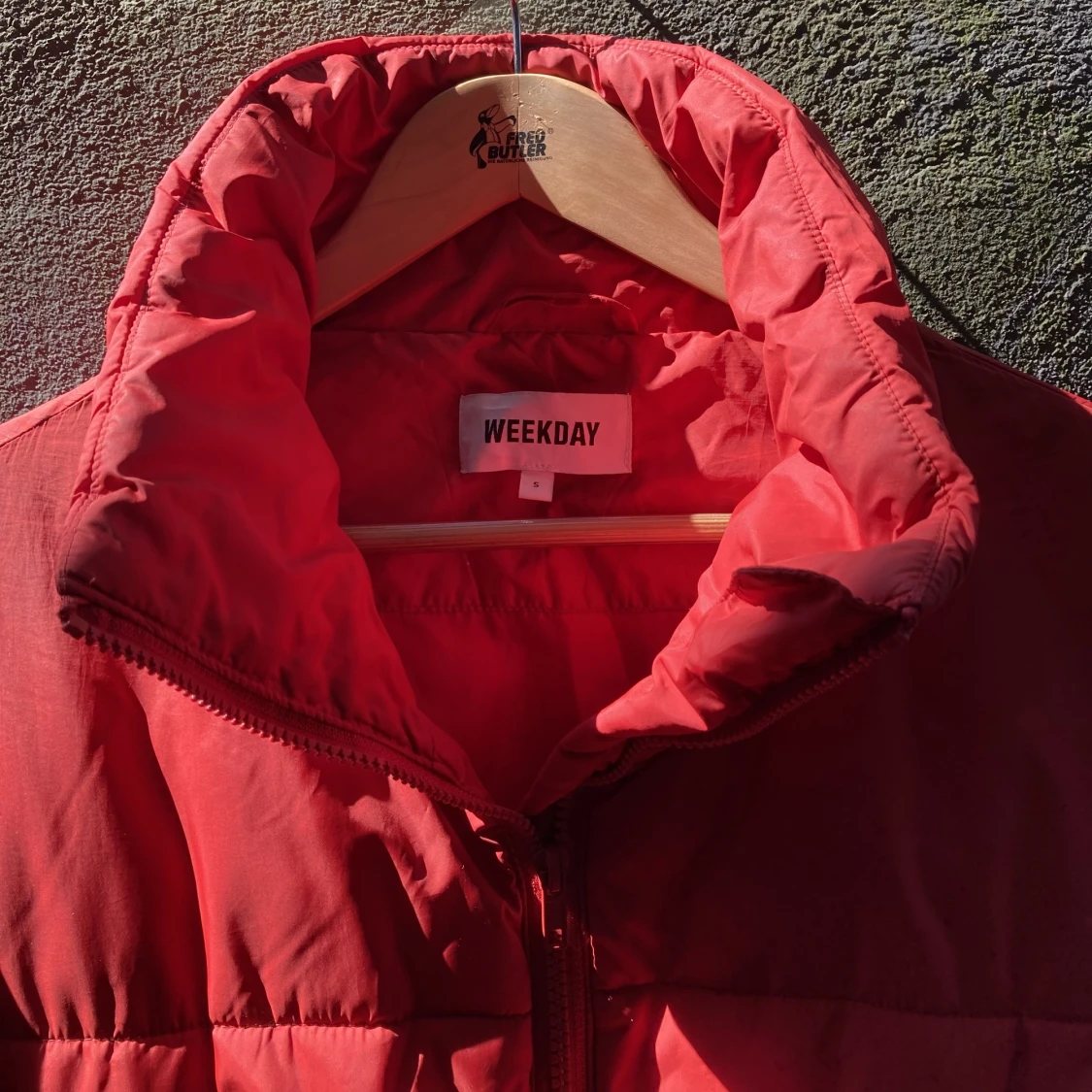 Röd jacka weekday, hög krage som oxå går att vika ner. Varm, mjuk! Strlk small men lagom oversized!