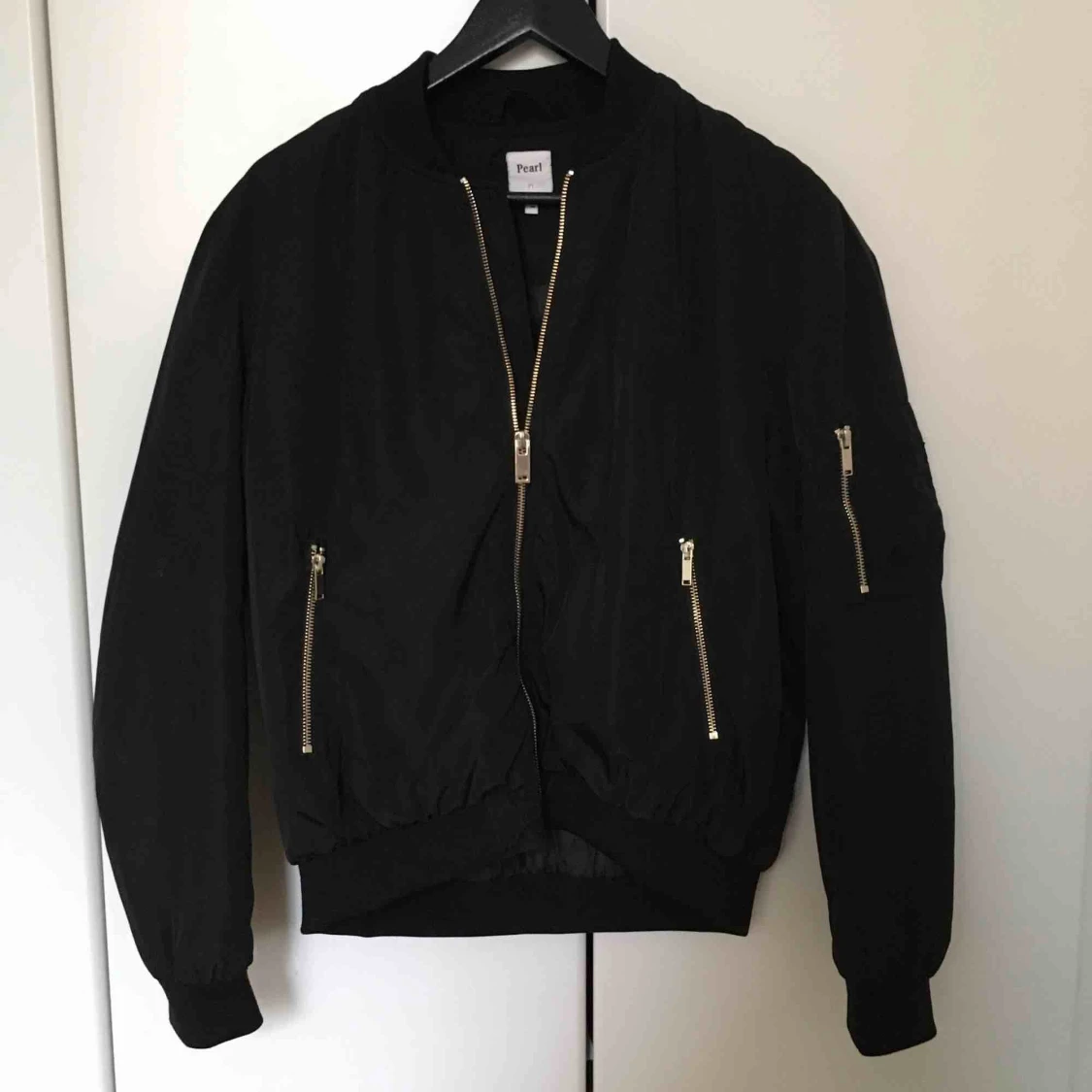 Svart bomberjacka. Guldfärgade dragkedjor. Inköpt 2017. Använts under vår och sommar. Svaga vita märken på jackärm samt rygg, ev kommit till efter tvätt. Se bild 2. Hål i en av jackfickorna. Annars i fint skick! Kan mötas i Malmö, annars tillkommer frakt.