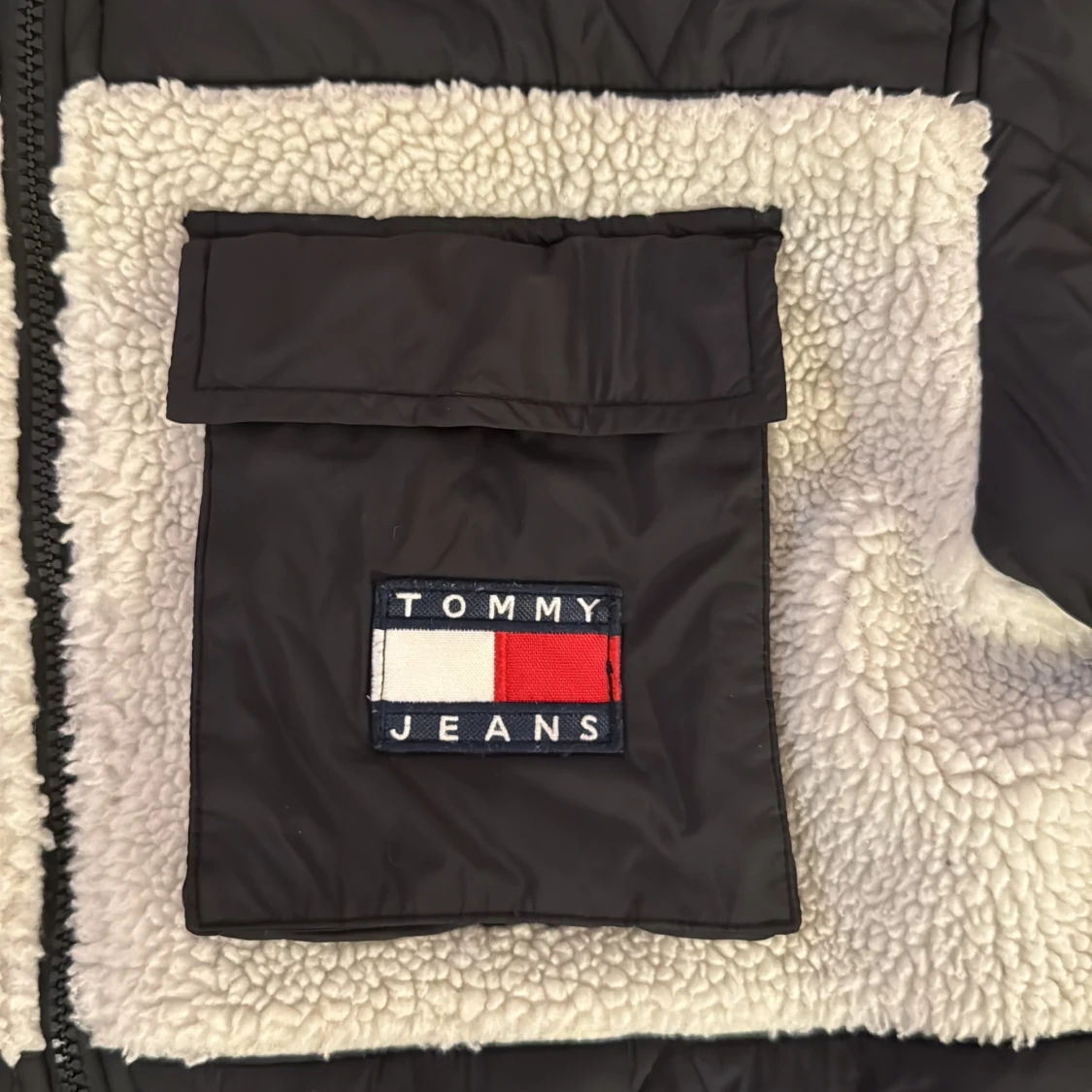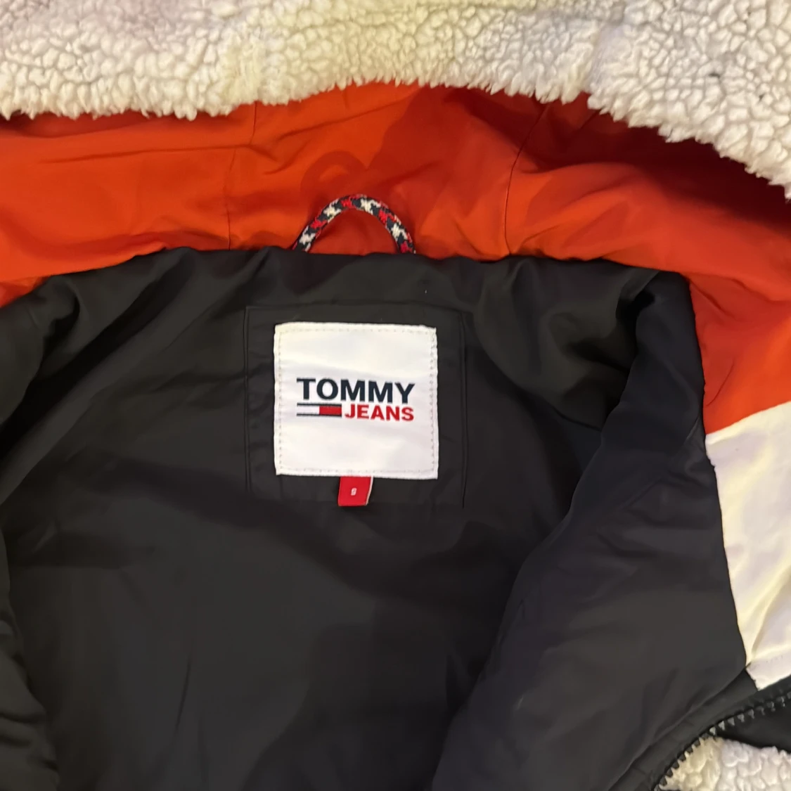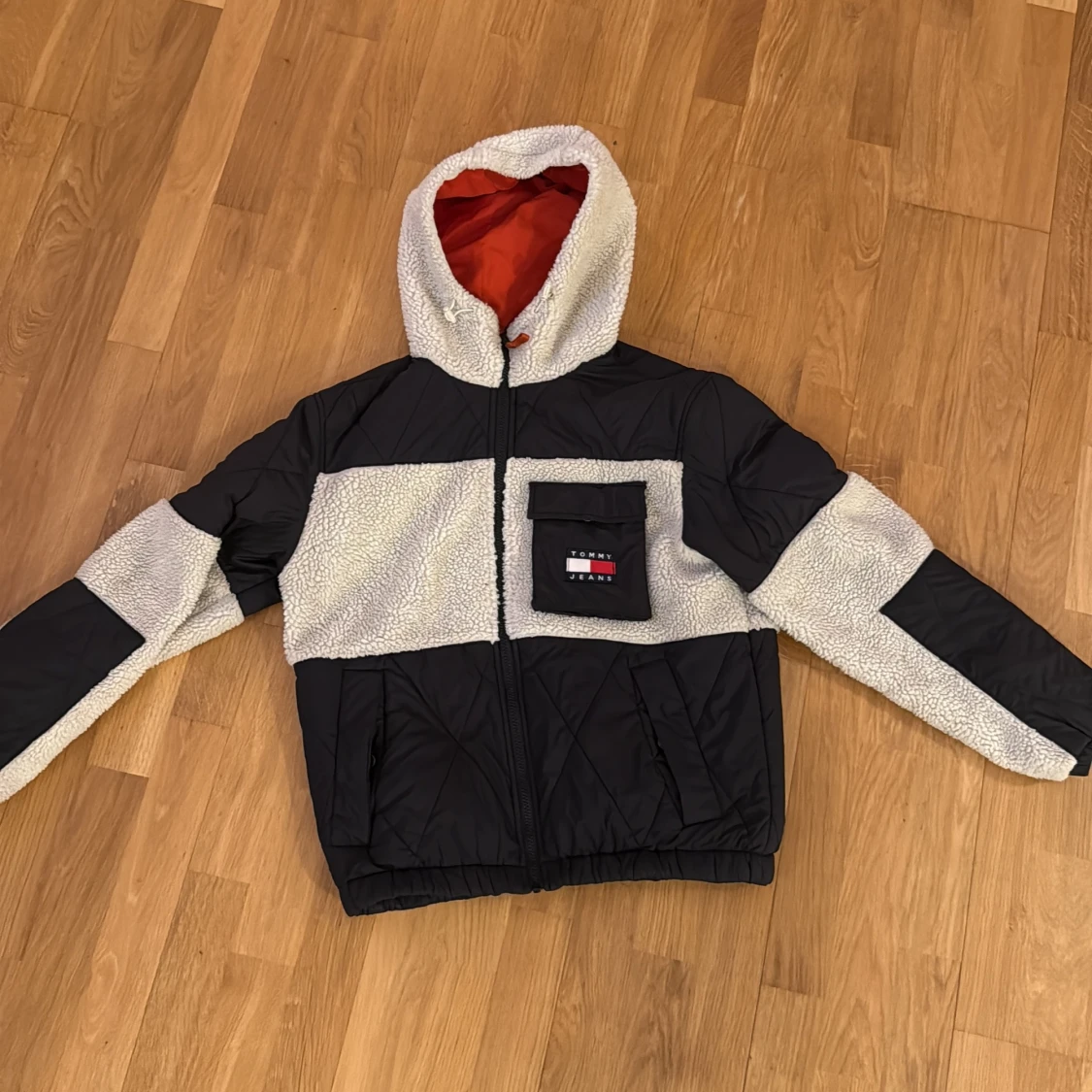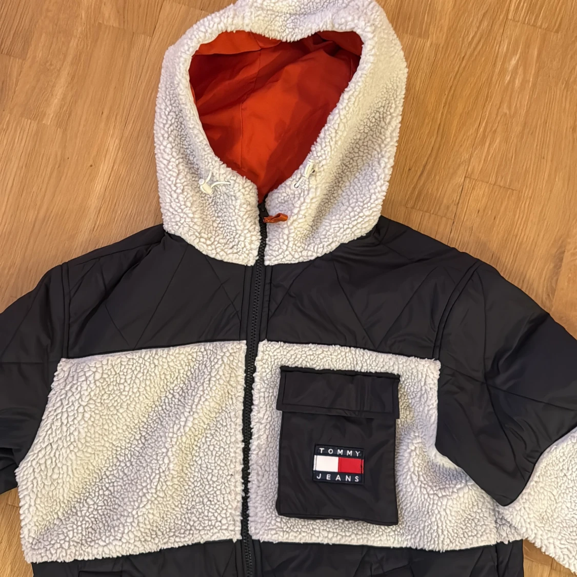 Snygg teddyjacka från Tommy Jeans i svart och vitt med kontrasterande orange foder. Jackan har huva, dragkedja, stor ficka med logga på bröstet och detaljer i mjuk teddy. Perfekt för kalla dagar och ger en cool streetstyle-vibe. Storlek M, säljer denna sköna jacka då den inte passar mig längre.