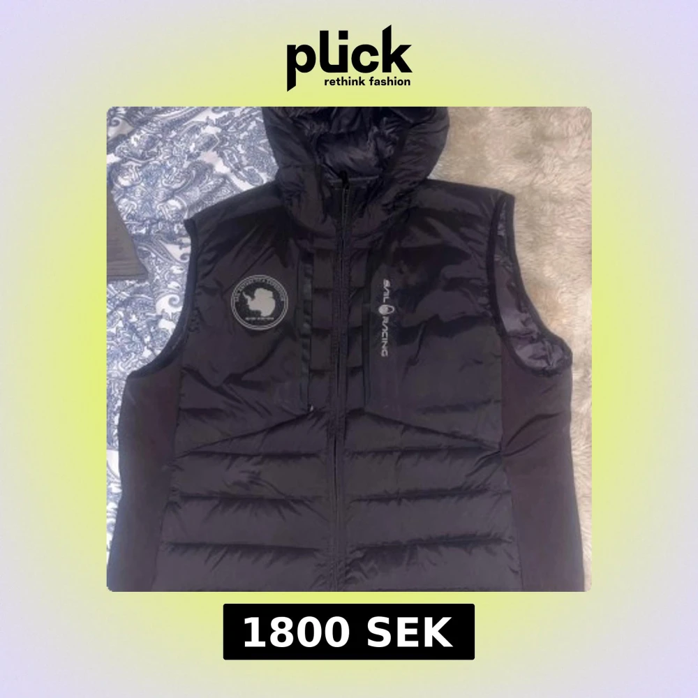 Svart dunväst från Sail Racing med huva och snyggt broderat märke på bröstet. Västen har dragkedja framtill och logotyp på framsidan. Materialet är polyester och dun, vilket gör den både lätt och varm. Bara använt 1 gång då den inte passar. Köpt för 2800kr för 2 år sedan.