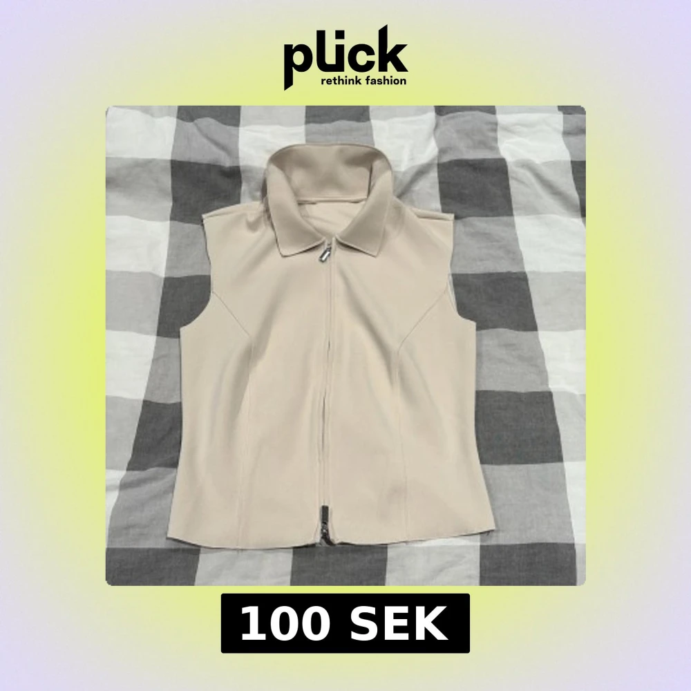Stilren beige väst med hög krage och hel dragkedja framtill. Västen har en figurnära passform och är tillverkad i ett slätt, mjukt material. Perfekt att styla över en skjorta eller t-shirt för en clean look.