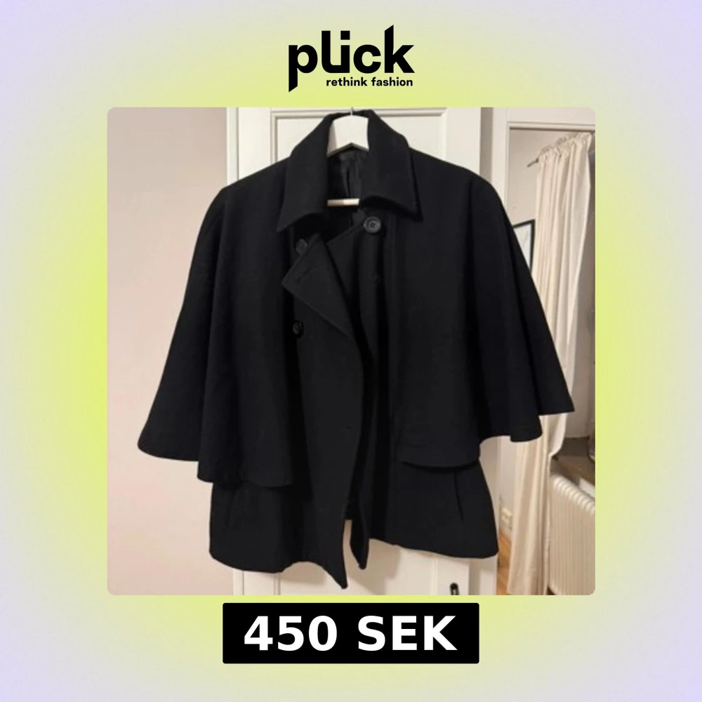 Säljer en svart poncho kappa med bred krage och dubbelknäppning framtill. Jackan har vida, trekvartsärmar och en snygg, lös passform. Perfekt för dig som vill ha en stilren och trendig look. Skriv vid frågor.💕skulle säga en storlek S/M. Tyvärr har en knapp ramlat av men som ni ser på bilderna är det inte anmärkningsvärt💗
