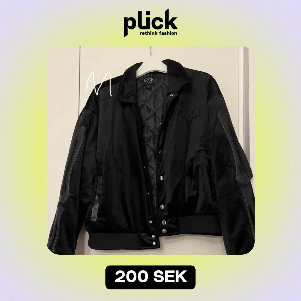 Säljer en snygg svart bomberjacka från MAN i storlek M. Jackan har en quiltad insida och stängs med knappar framtill. Den har långa ärmar och ribbade muddar vid ärmslut och nederkant. Perfekt för höst och vår!