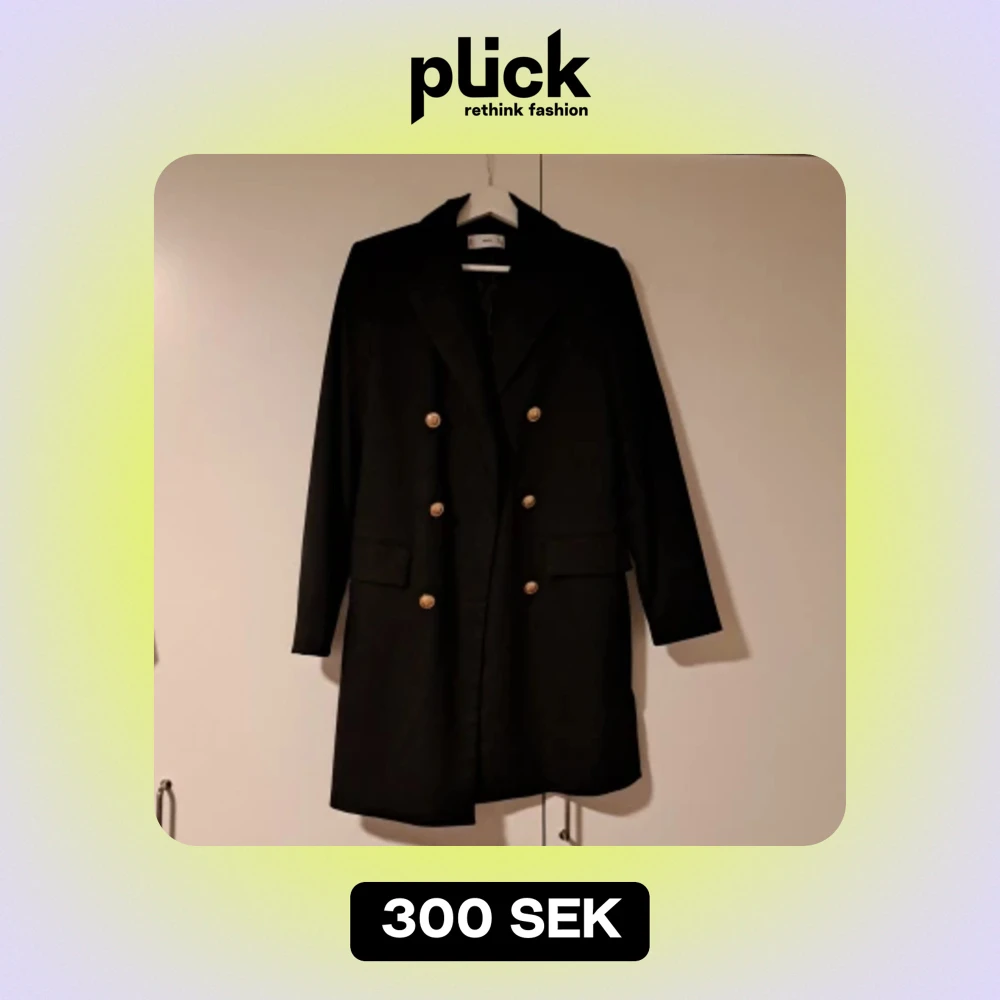 En svart lång kavaj med guld knappar i bra skick. Den är anvönd med ser nästan som ny ut. Jag har strlk S/M men sitter lite tajt så skulle rekomenders denna till någon som är S/XS för att den ska passa bra, och XSS om man vill ha den lite oversized.